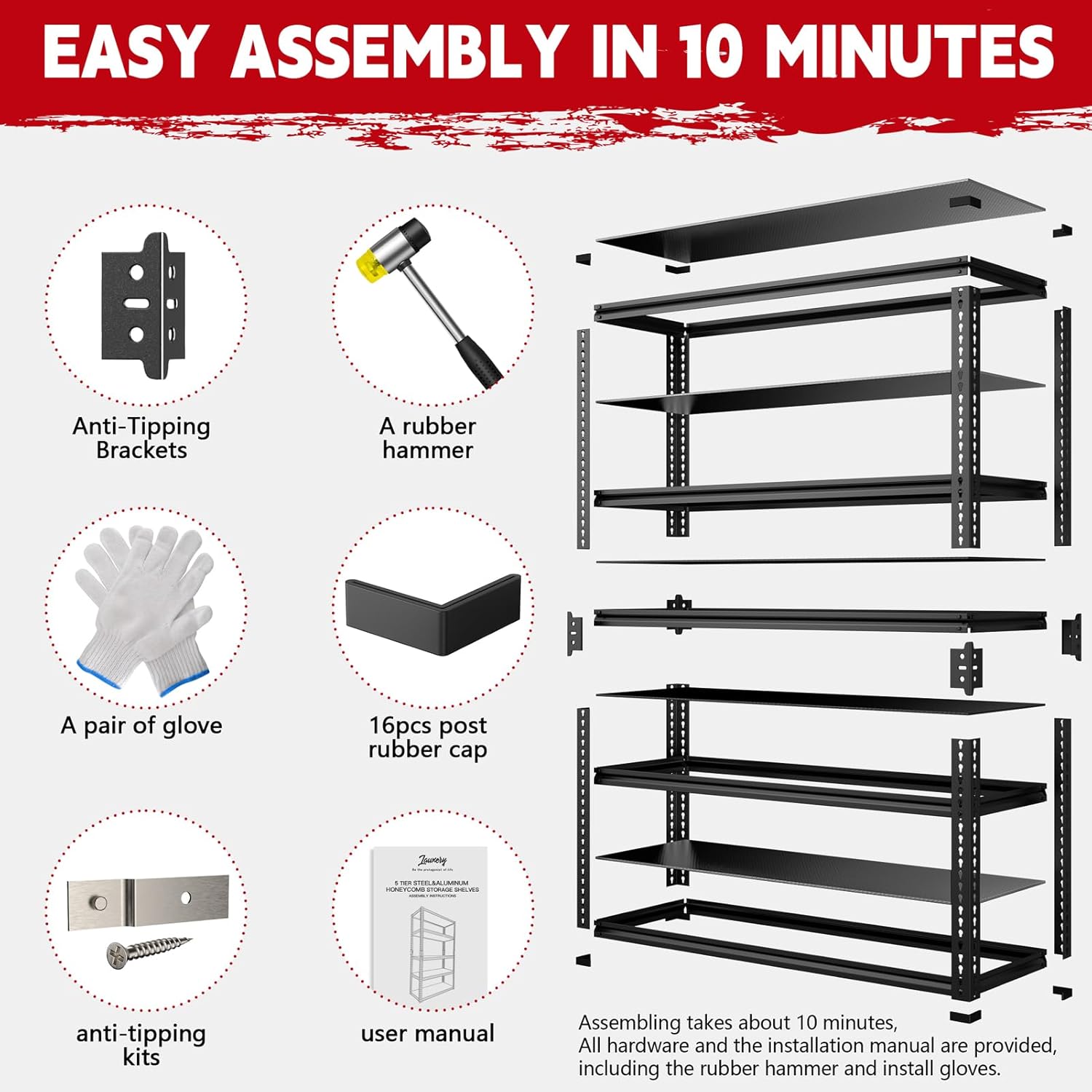 - Easy Set-up Boltless Shelving: No more struggling with confusing instructions and fiddly screws or bolts. This metal storage shelf for the garage features a unique interlocking design that makes assembly a breeze. Just slide and secure the frame into the post hole. Comes complete with all the essential accessories β a hammer, gloves, anti-dumping kits, and more. You'll have it set up in minutes. Get organized easily with our hassle-free boltless shelving.