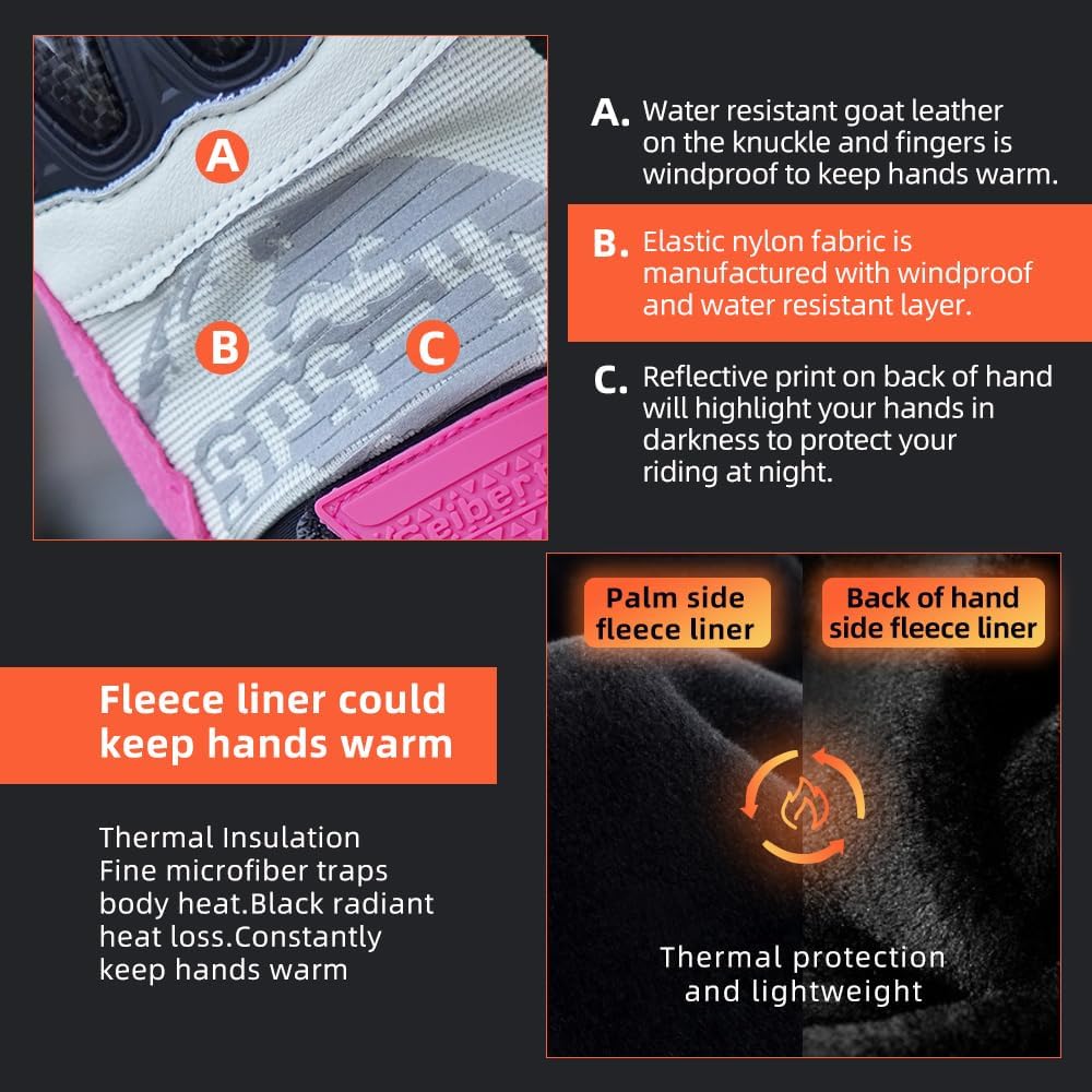 - Water resistant process on entire glove;Fleece liner inside;Double threads stitching on the palm;Palm sliders installed on side of the glove;TPR pulling tab on the wrist with Seibertron glove clip hole;TPR impact protection on top of fingers and palm slider