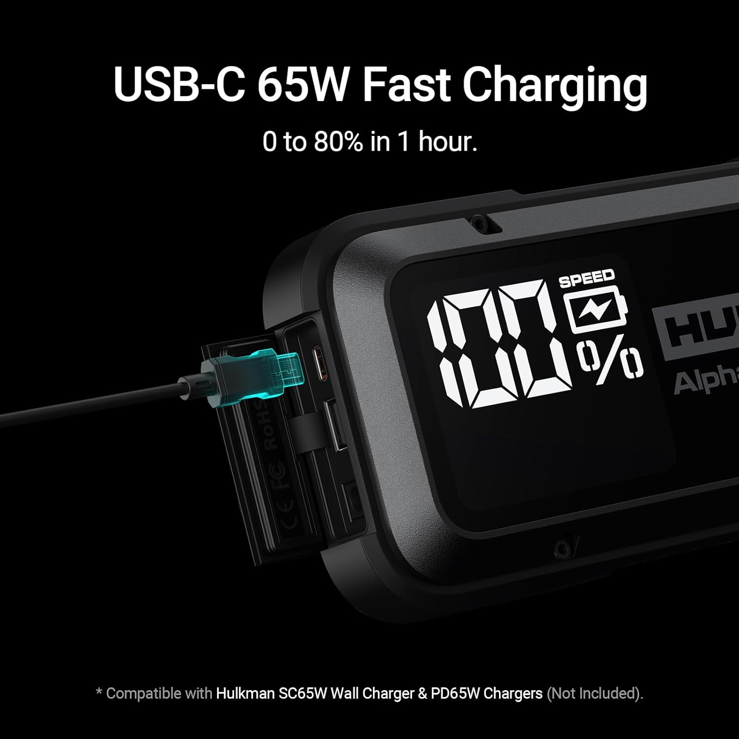 - [What's in the Box] Everything you need: jump starter, clamps, DC adapter, USB-C cable, and manual. A ready-to-go car jump starter kit with 2 years of support. Note: The Hulkman 65W Wall Charger is sold separately.