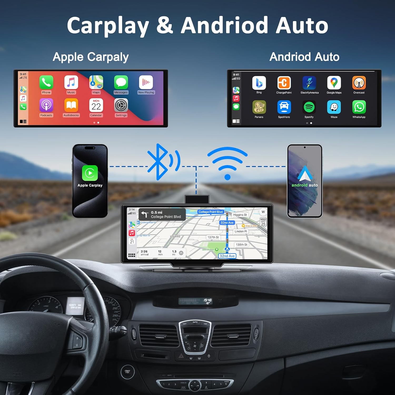 Apple carplay & Android Auto,Wireless Double din 10.26 inch Dash Cam with Front Camera and Backup Camera.GPS Navigation,Mirror Link/Voice Control/Bluetooth for Car RV Pickup Bus Trailer.etc