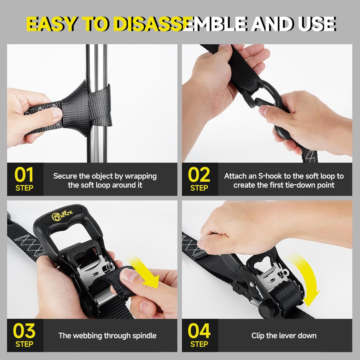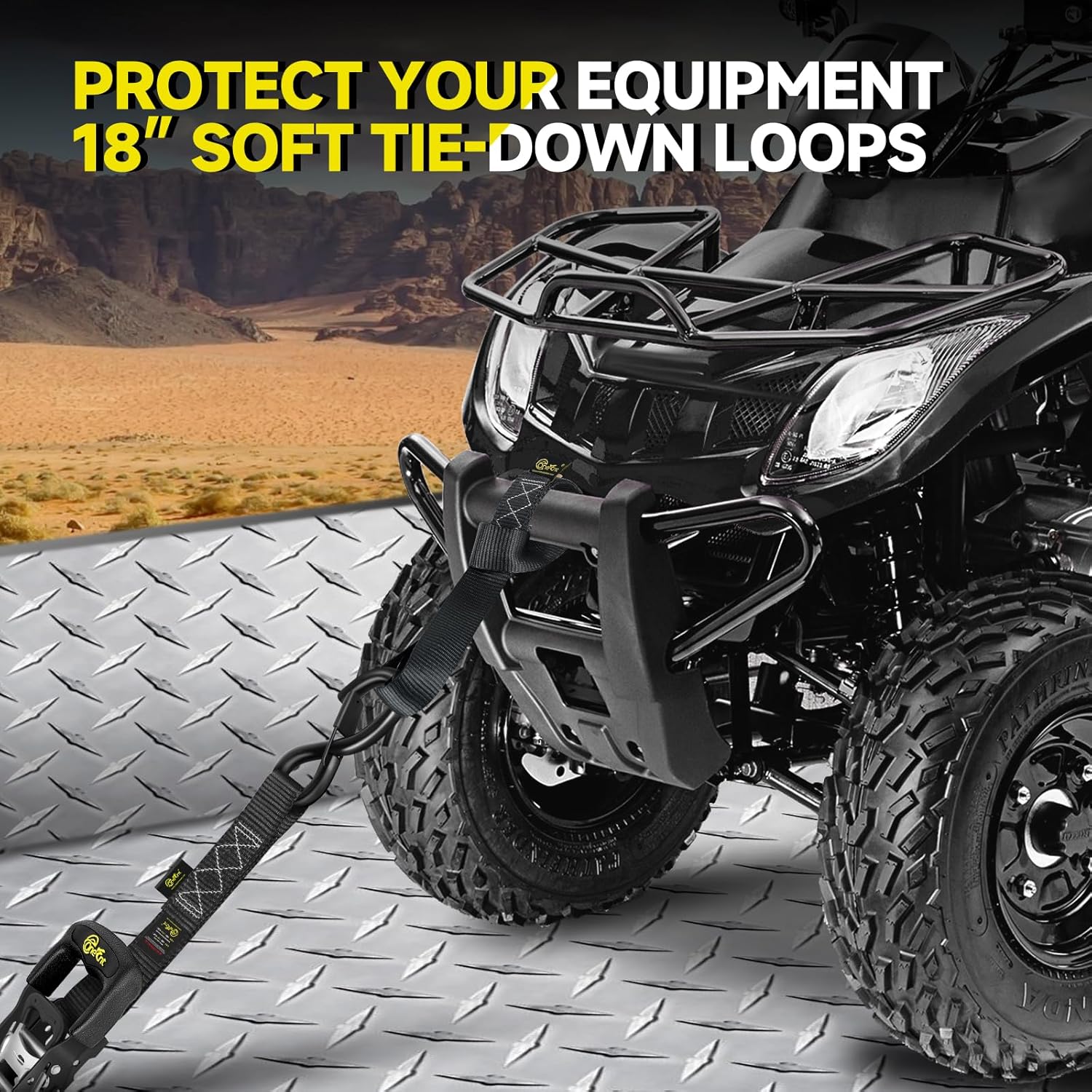 - Upgraded Ratchet Strap Kit : Our powerful tie-down strap kit includes (4) sturdy 1.6” x 10’ ratchet straps with padded handles, coated S-hooks with safety clips, and (4) 18” soft tie-down loops, all extended and thickened for ultimate reliability and ease of use.
