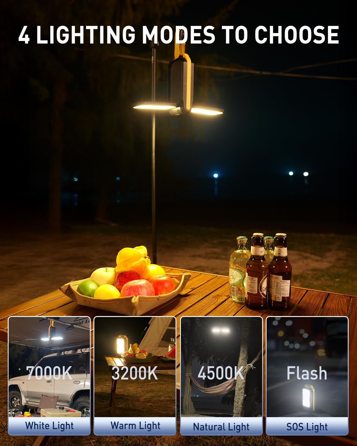 - â€ăHangable Camping LightăUltra-bright 4000 lumen LED dual panel light is angle adjustable to provide 360° illumination that lasts for 24 hours! With four lighting modes (cool white, warm yellow, yellow-white and strobe), works as camping light/work light/reading light