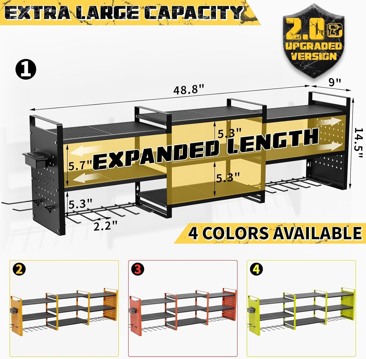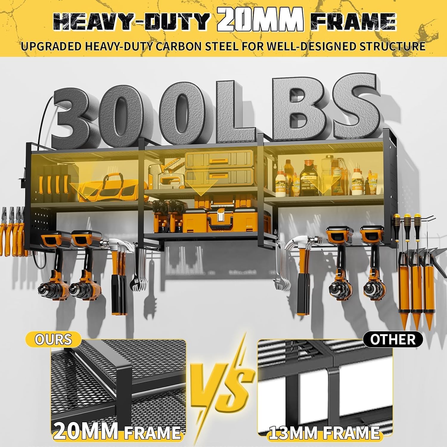 - Versatile Garage Storage Rack: The top shelf holds heavy-duty tools like electric and miter saws, while the middle and lower shelves fit medium-sized items like chargers, batteries, and toolboxes. The 5.4-inch side pegboard hooks keep hammers and screwdrivers organized and accessible. This wall-mounted garage organization saves floor space, transforming a cluttered area into an organized workspace. Note: Tools shown are for display only and are not included