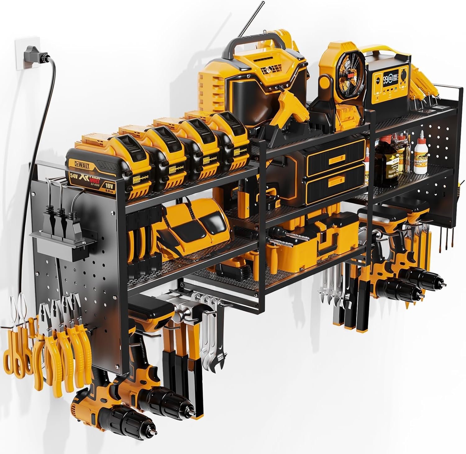 - Expanded Width to Maximized Storage: The Xankzi power tool organizer wall mount with charging station features a patented wide design in its 2 central shelves, perfect for storing more tools, especially longer items like chainsaws. Measuring 45.6" wide, 16.5" high, and 8.7" deep, this sturdy and space-efficient power tool storage rack keeps your tools organized