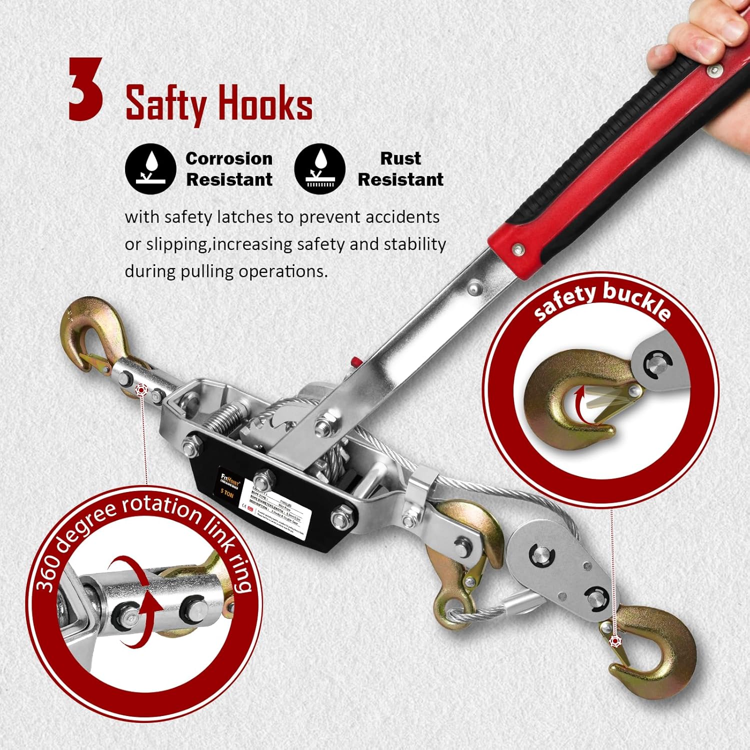 - [Winch Hook] Three hooks with self-closing safety latches ensure secure attachment, preventing accidents or slipping and enhancing safety and stability. The new and improved wavy rubber slip-resistant handle provides greater comfort, a better grip, and extra leverage. Our come-along puller's anti-reverse mechanism keeps your tasks on track by preventing backtracking or cable slack