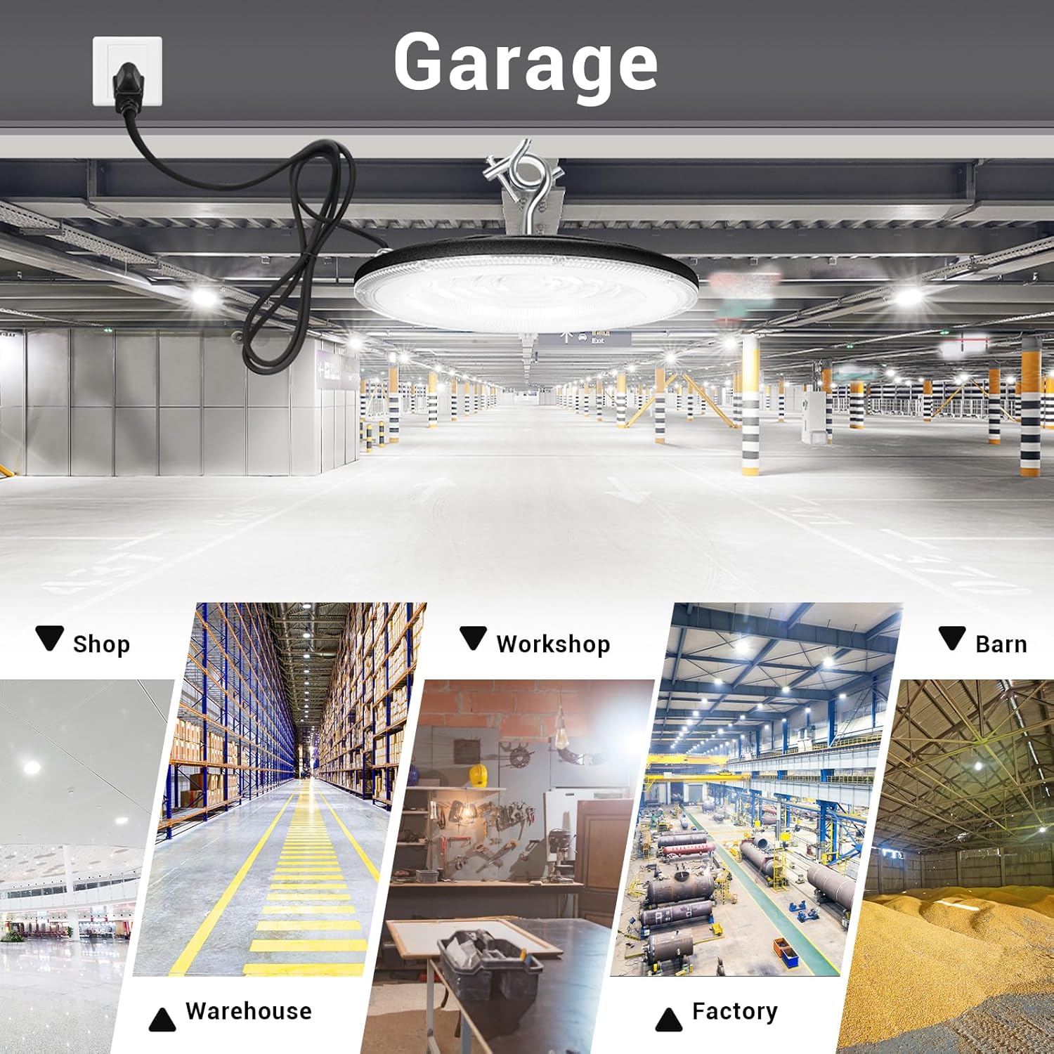 - 【Durable/Long Service Time】This UFO LED high bay light adopted high quality non-flickering driver ensure it over 50,000hours lifespan. It comes with an die-casting aluminum shell which features great thermal conductivity, these make the light durable and excellent heat dissipation. for workshops, barn, gymnasiums, factories, exhibition halls, shopping malls, supermarkets, storage yards, basements and any other large commercial and industrial places.