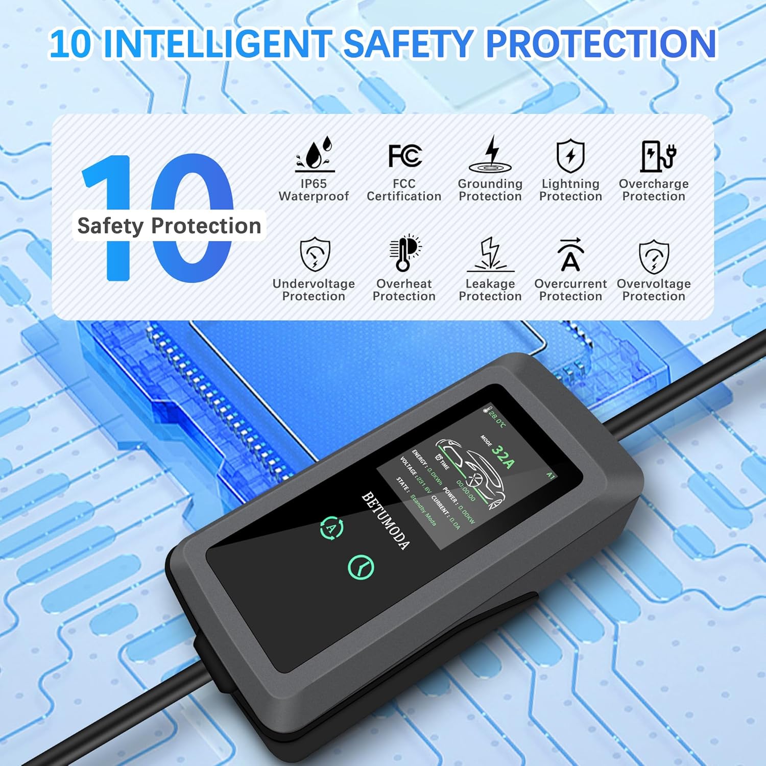 - Safety: Our charger has passed FCC certification and is equipped with built-in over-voltage, over-current, and short-circuit protection. In the event of an overload, the protection mechanism will automatically report errors and power off to ensure top-notch safety. Additionally, its IP65 waterproof design ensures durability and safety in various weather conditions.๏ผ Important Reminder: Please only use the original adapter included with this charger. Using third-party or incompatible adapters may lead to overload, short circuits, or damage to your vehicle or EV charger.)