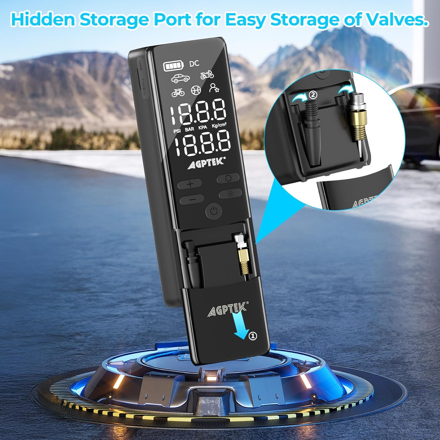 - Storage Compartment: Featuring a convenient storage compartment, this pump allows you to store three various inflatable parts by opening the lid on the lower half of the device to prevent small parts from getting lost. The cordless tire inflator boasts a compact design that is both portable and space-saving. Easy to store in cars, bike racks, or backpacks, it is ideal for on-the-go inflation needs during travel or at home. This cordless tire inflator comes with multiple accessories and is an essential product for drivers, cyclists, and adventure enthusiasts.