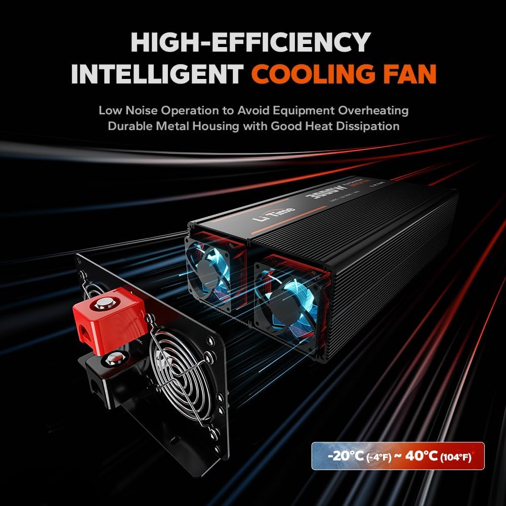 - All-round Safety Protections: The LiTime Inverter ensures all-around safety with over-voltage, low-voltage, overheat, overload, and short-circuit protections, safeguarding both your devices and the system. Its high-efficiency dual cooling fans intelligently regulate temperature, enabling smooth performance even in extreme environments (-20β to 40β).