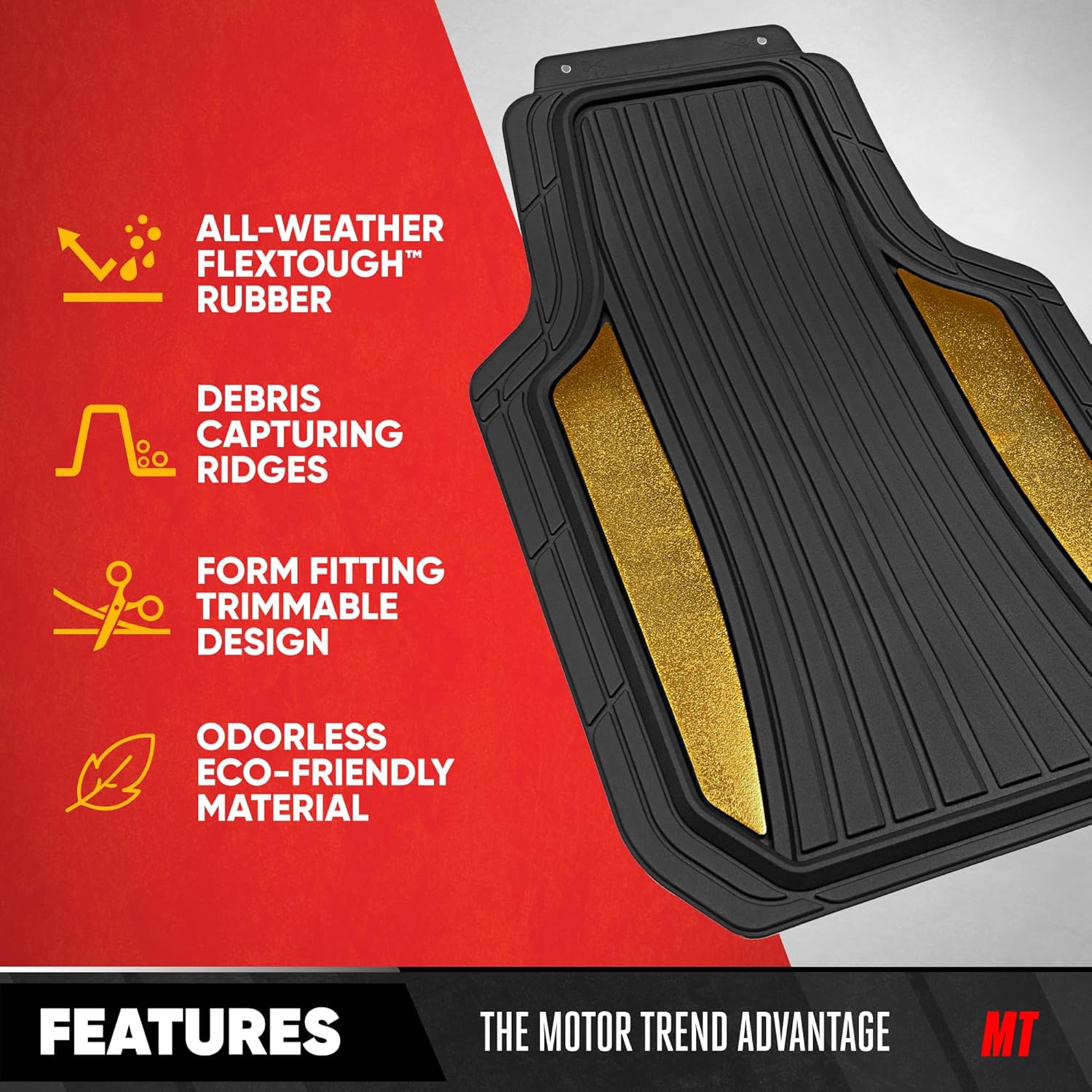 Motor Trend ChromeTech Car Floor Mats Full Set - Durable Rubber Floor Mats for Cars with Two Tone Accent, All Weather Interior Protection for Front and Rear with Non-Slip Backing, Black/Gold