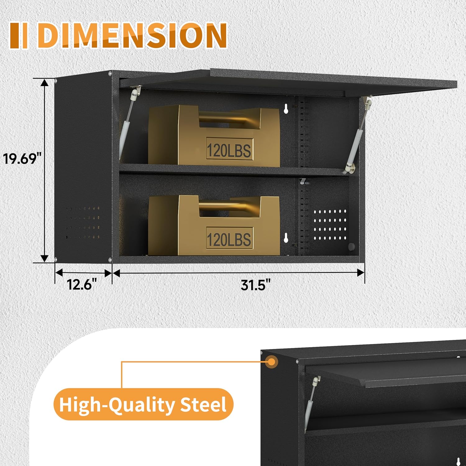 - ăSafely On The WallăFirstsky Garage Wall Cabinet is made of high quality materials, carefully designed and rigorously tested to ensure a solid structure, capable of storing heavy objects without warping. There are four holes on the back panel to secure it to the wall for extra stability. Up to 120 pounds weight capacity allows you to store any item you want. Compared to other cabinets, you can hang more tools on the sides while it remains stable.