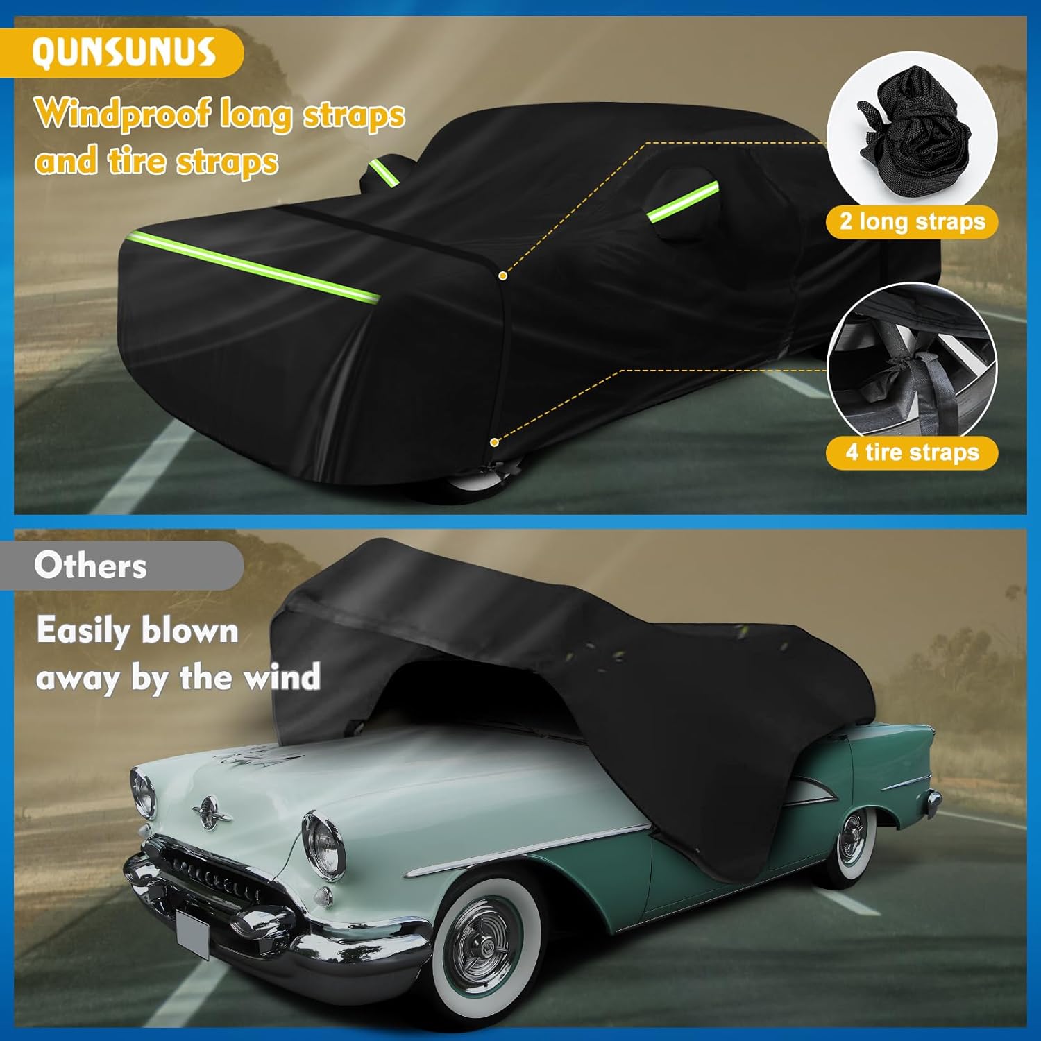 - 【Windproof Upgrade】1.There are four tire straps to keep the car covers secured in place.2. Buckle the windproof buckle that goes through the bottom of the car.3. Elastic hems on the front and back end for a better fit on your car.4. Two complimentary extra-long windproof straps can be strapped to your car's hood and rear.