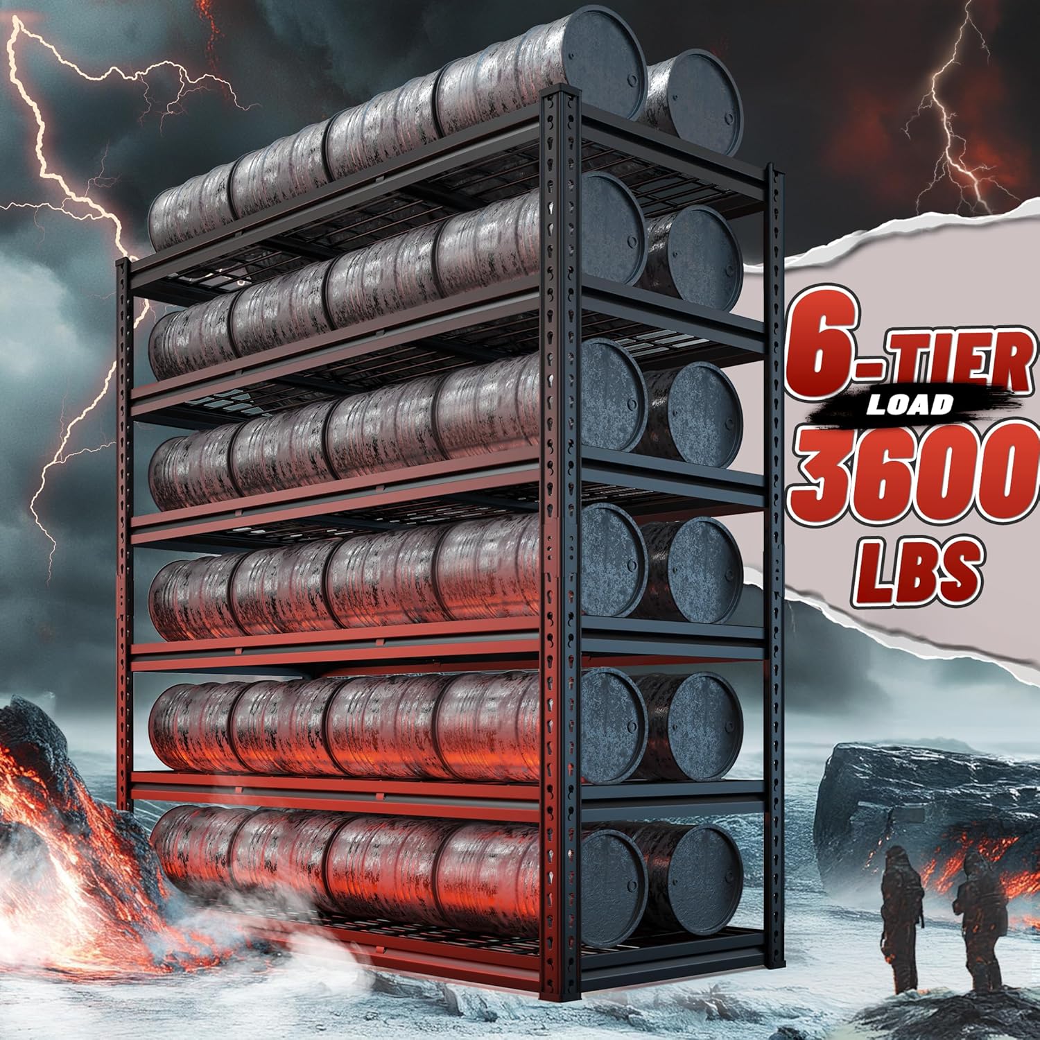 - 【3600LBS Capacity Storage Shelves】The REIBII garage shelving is made of premium steel material.Each sturdy shelf layer can hold up to 600 LBS for a total carrying capacity of 3600 LBS.The metal shelving has 2 support ribs and 4 stiffeners to avoid heavy deformation and bending of this storage shelves