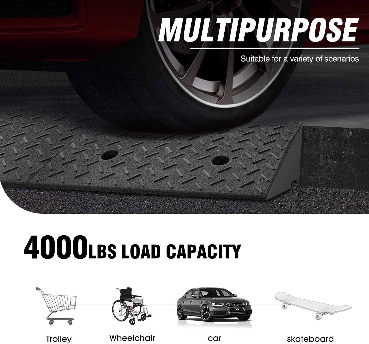 - WIDELY USED - From small to medium-sized vehicles to toy cars, It can greatly protect the safety of going up and down stairs, and are also a good choice for mobility issues; Widely used in households, warehouses, garages, etc; If you are concerned about the smell of rubber, we suggest that you can leave the wheelchair ramp outdoors for more than 1 days for ventilation.