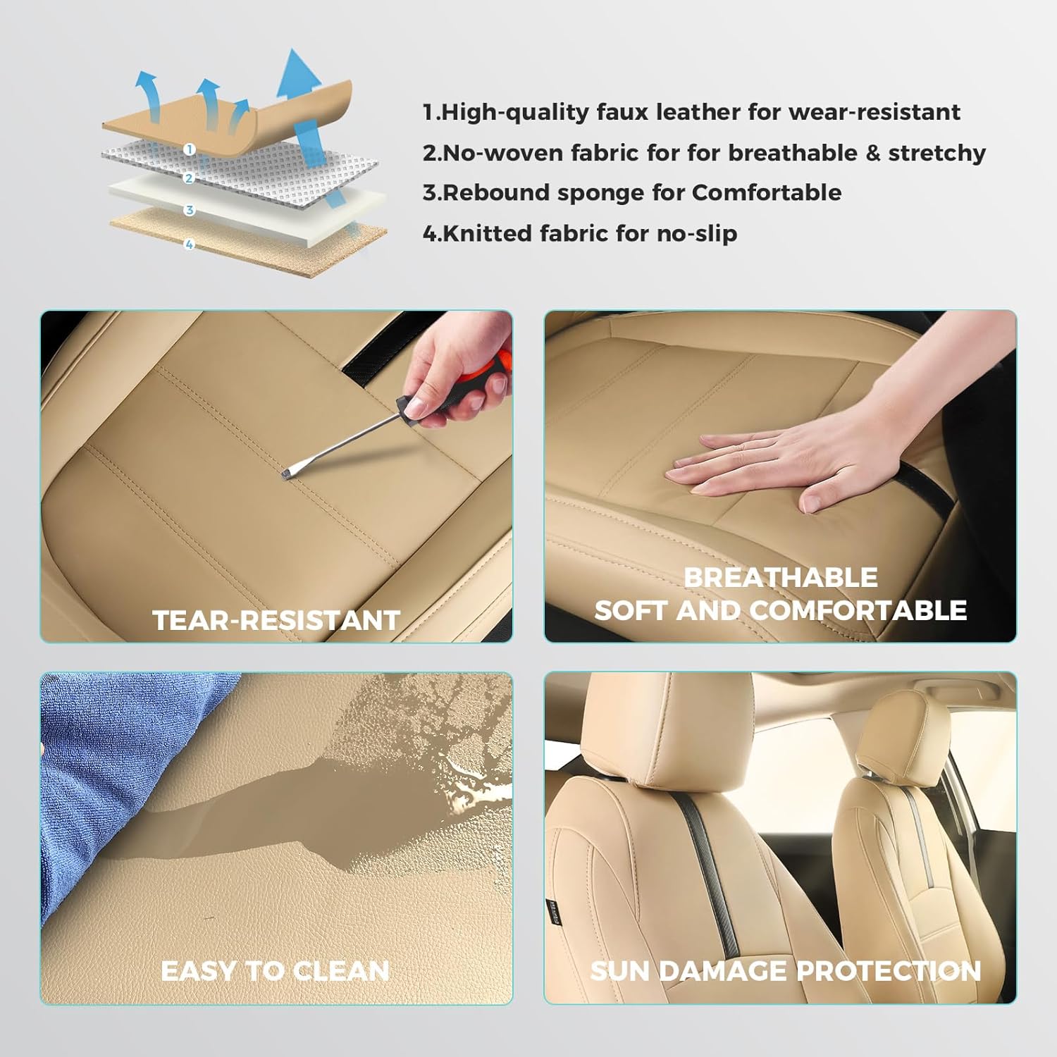 - Faux Leather - Our car seat covers are made from faux Nappa leather, providing superior protection for car seat covers. Designed with comfort, aesthetics, and longevity in mind, these leather seat covers are also waterproof, stain-resistant, and easy to clean. They are an excellent choice for individuals seeking to upgrade or protect their car's upholstery