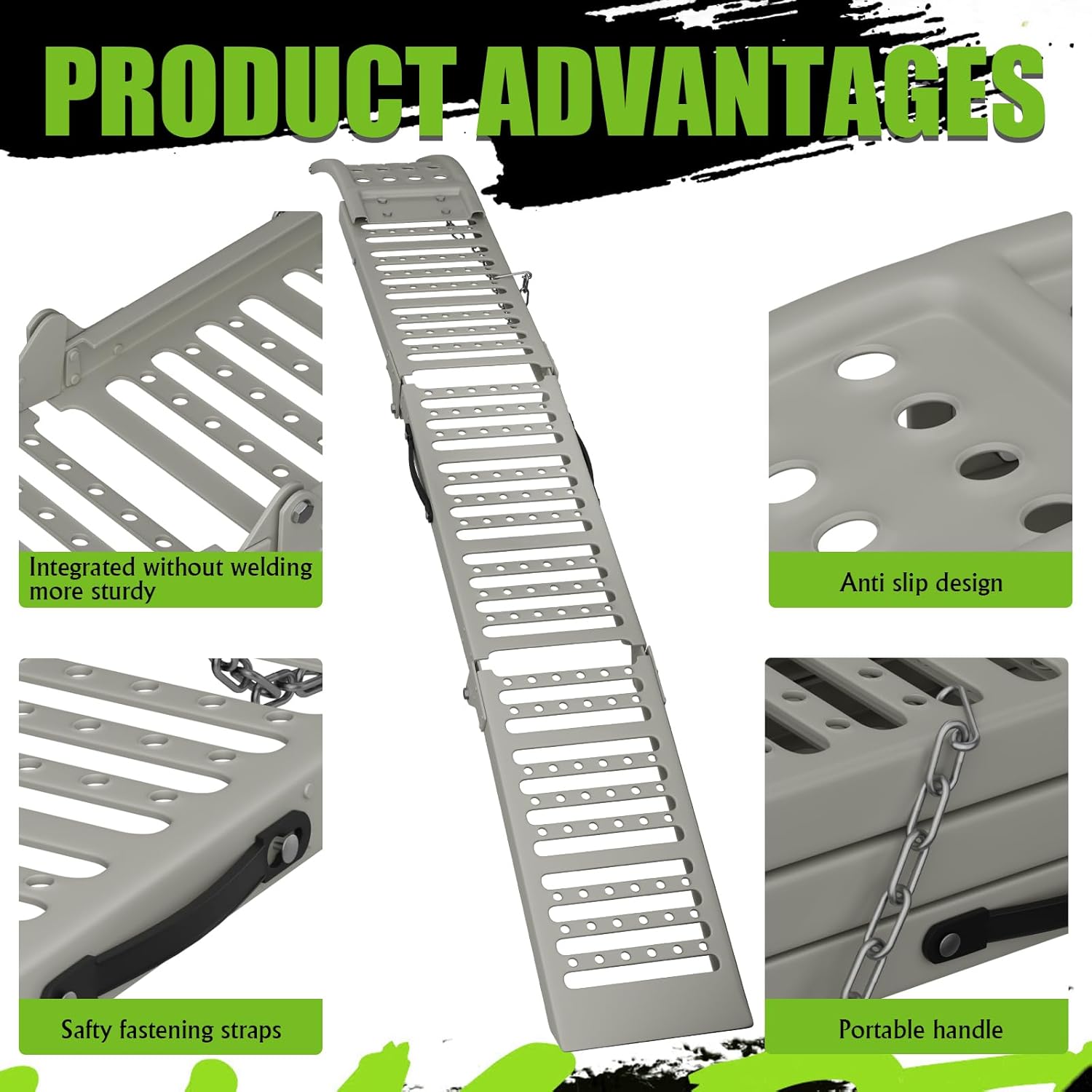 - 【Durable and Robust Construction】:Our trailer ramps is a one-piece design without any weld points, making it stronger than loading ramps with joints. Additionally, it comes with metal hooks that can be attached to a vehicle, preventing accidental detachment during use