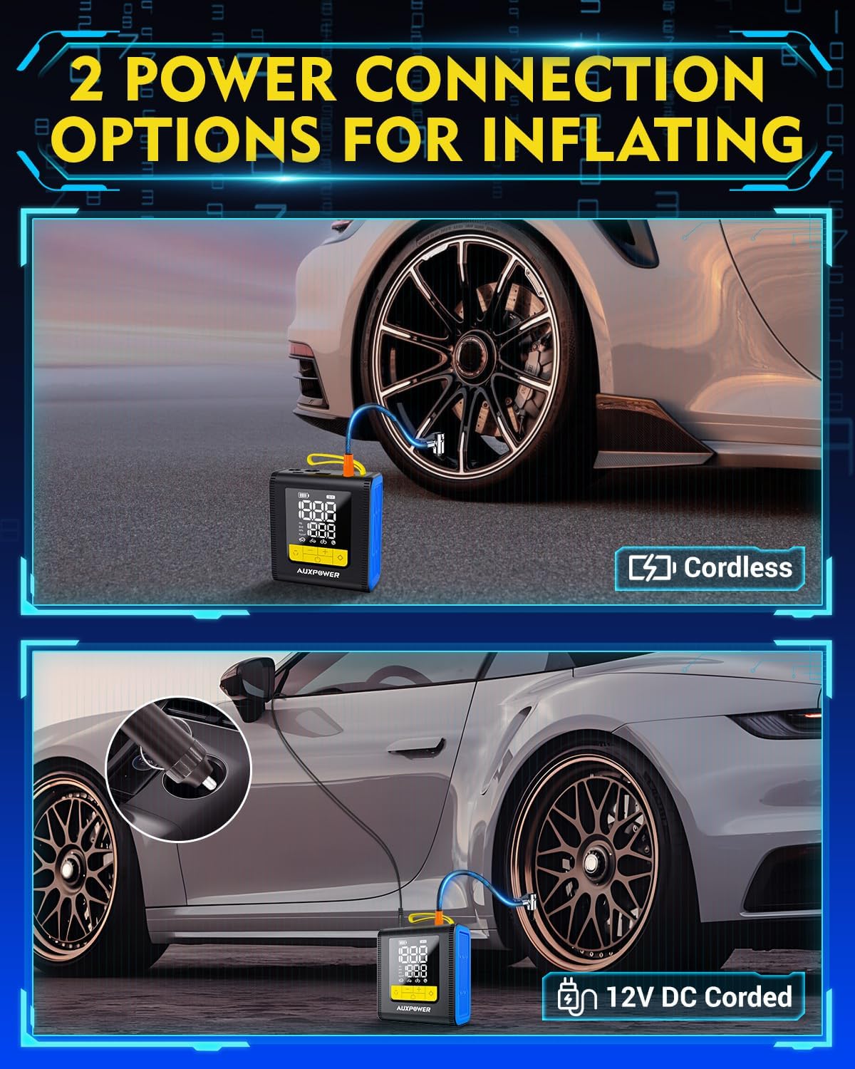 - 🎁【WHAT YOU GET] 1* portable tire inflator, 1* 0.79ft air hose, 4 different air nozzle, 1*DC12V cigarette lighter cable, 1* Type-C charge cable, 1* drawstring bag, 1* user manual. Auxpower portable car tire air compressor is a great gift for your boyfriend, husband, father.
