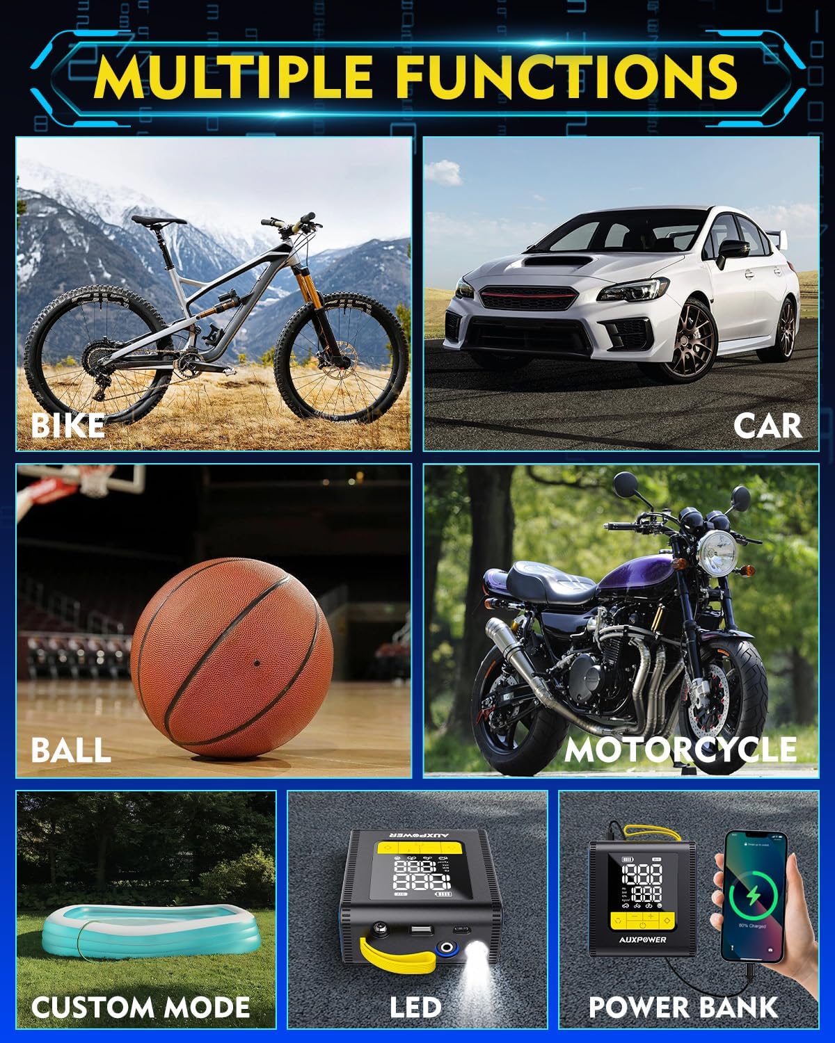 - ⚙️[4+N SMART PRESET MODES] Start intelligently with one click without complicated setup. Auxpower tire inflator portable air compressor offers 4 preset inflation modes ( car, motorcycle, bike, ball) and a manual custom modes to perfectly suit your unique needs.Smart preset modes make it easy to start inflating while you're on the go.