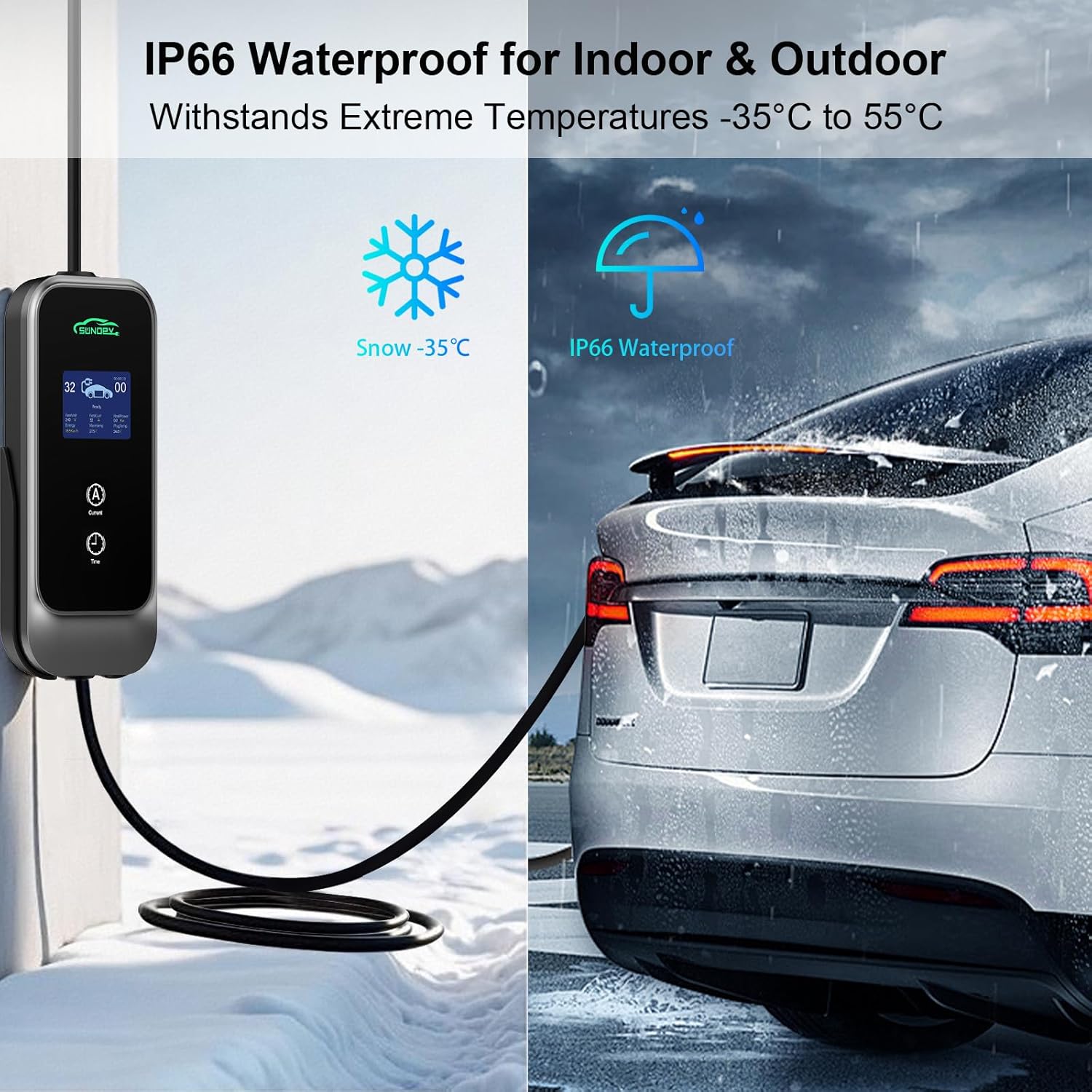 - 【J1772 Universal 】This level 2 EV charger works seamlessly with all SAE J1772 EVs and PHEVs (Tesla requires a J1772 adapter, not included).It also has a 25ft charging cable for flexible positioning in garages or outdoors. The ultra-durable design withstands extreme temperatures (-35°C to 55°C) and resists tangling, abrasion, and UV damage for long-term reliability.