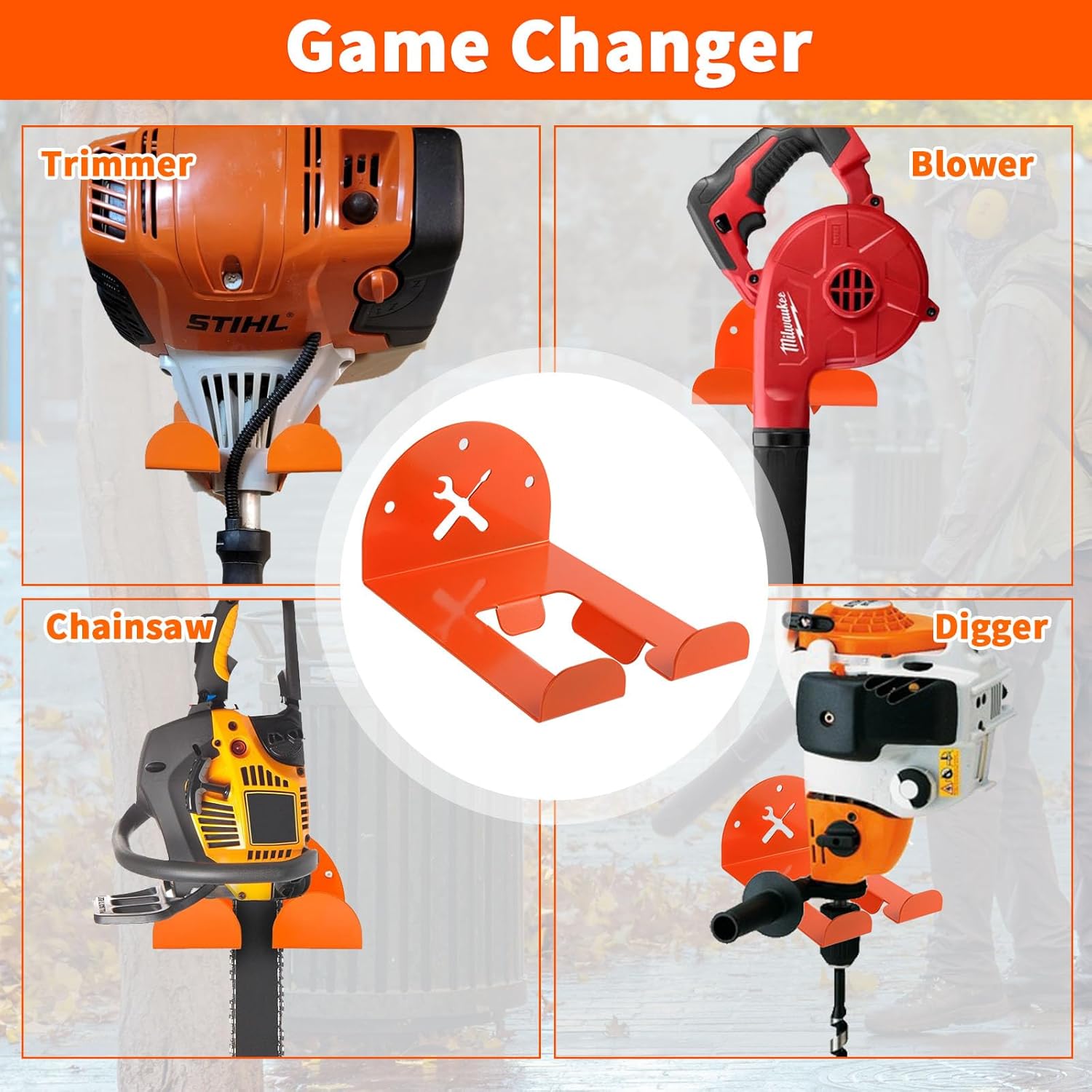 - [Heavy Duty] Proudly engineered by the Iulrtba design team in Troy, VA, our weed eater hanger brackets are constructed of 5/64" thickened 12 gauge stainless steel, which can handle up to 200 lbs and give you total confidence that your equipment is firmly stored. Each wall mounted grass trimmer rack is powder coated in durable orange paint, which perfectly matches the color scheme of Stiehl tools. The silicone pads protect your items from scratching or damage when rubbing up against the hook