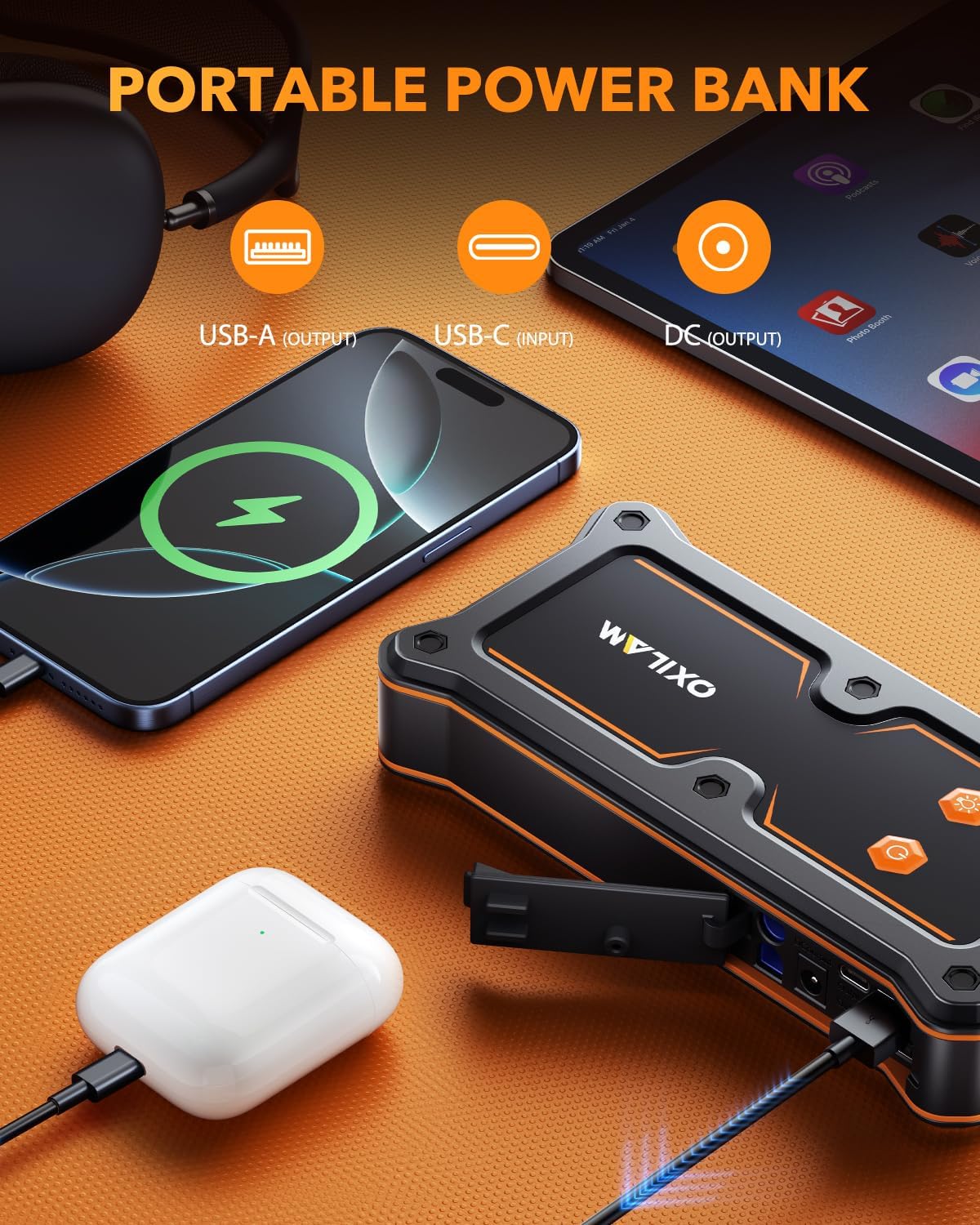 OXILAM 8000A Jump Starter - Car Jumper Starter Portable for All Gas & Diesel Engines, 12V Jump Box for Car Battery with Extended Jumper Cables, USB, DC, Type C Port & LED Light