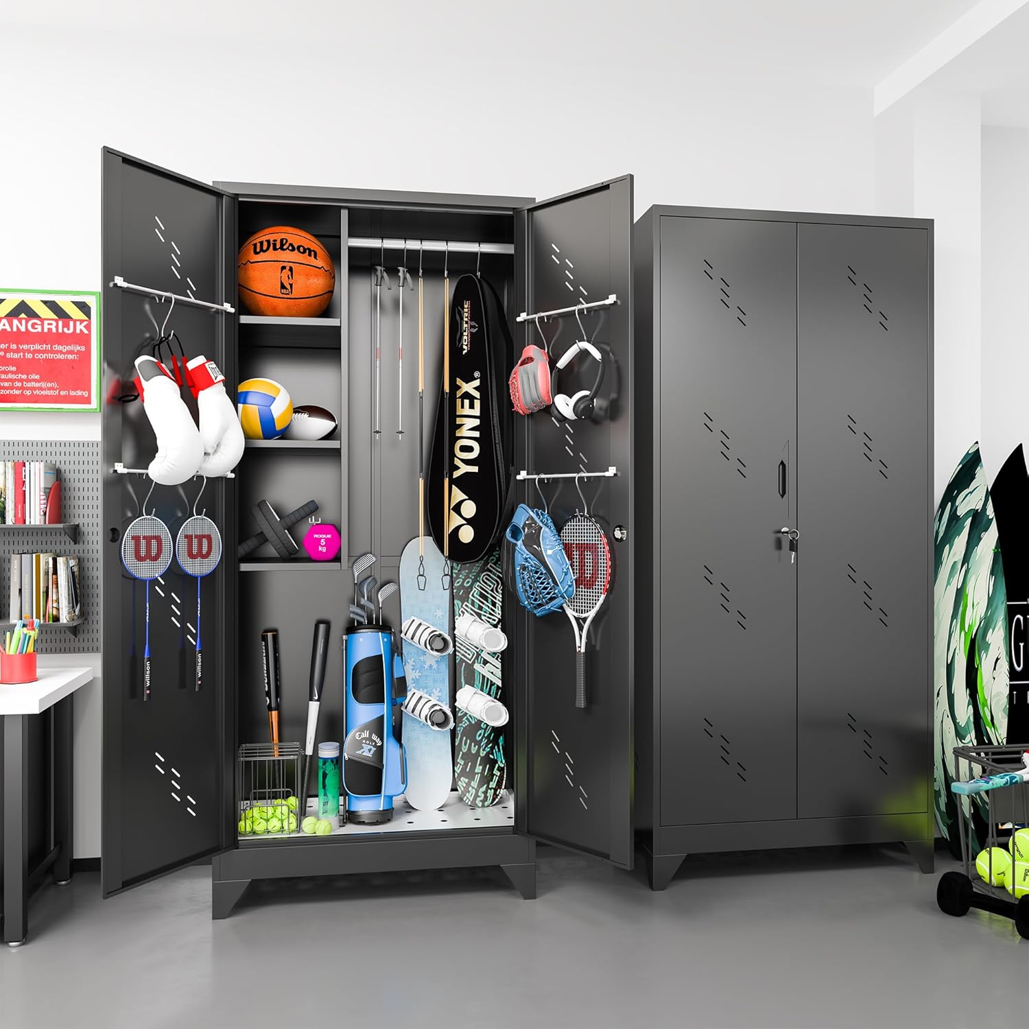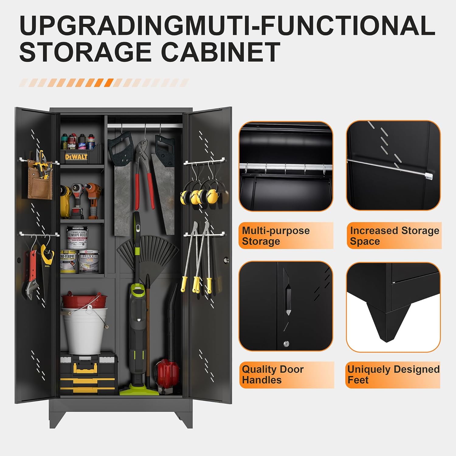 - ăSturdy and DurableăThe garage tool cabinet is made of high-quality metal, with a load-bearing capacity of 150 pounds per layer without deformation. You can use it to store various tools such as brooms, mops, brushes, sweepers, lawnmowers, and skis