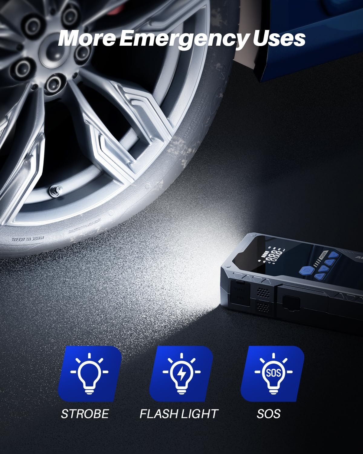 - â€ăAll-in-One Utility ToolăThis multifunctional device combines a powerful car jumper starter portable, a high-efficiency air compressor, a bright 400-lumen LED flashlight, and a high-capacity power bank. With USB and Type-C ports for versatile charging options, itâs your ultimate companion for emergencies, road trips, and everyday adventures. This jumper box for car battery portable is designed to meet all your needs.