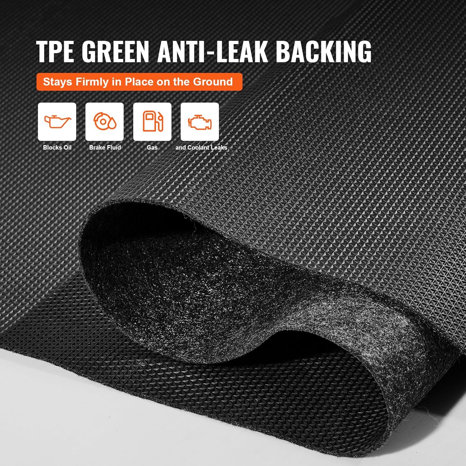 - TPE Waterproof Layer: The garage mat roll utilizes TPE odorless waterproof backing, making it resistant to substances like motor oil, brake fluid, or other liquids. After use, your floor will have no traces, looking as if it was just installed.