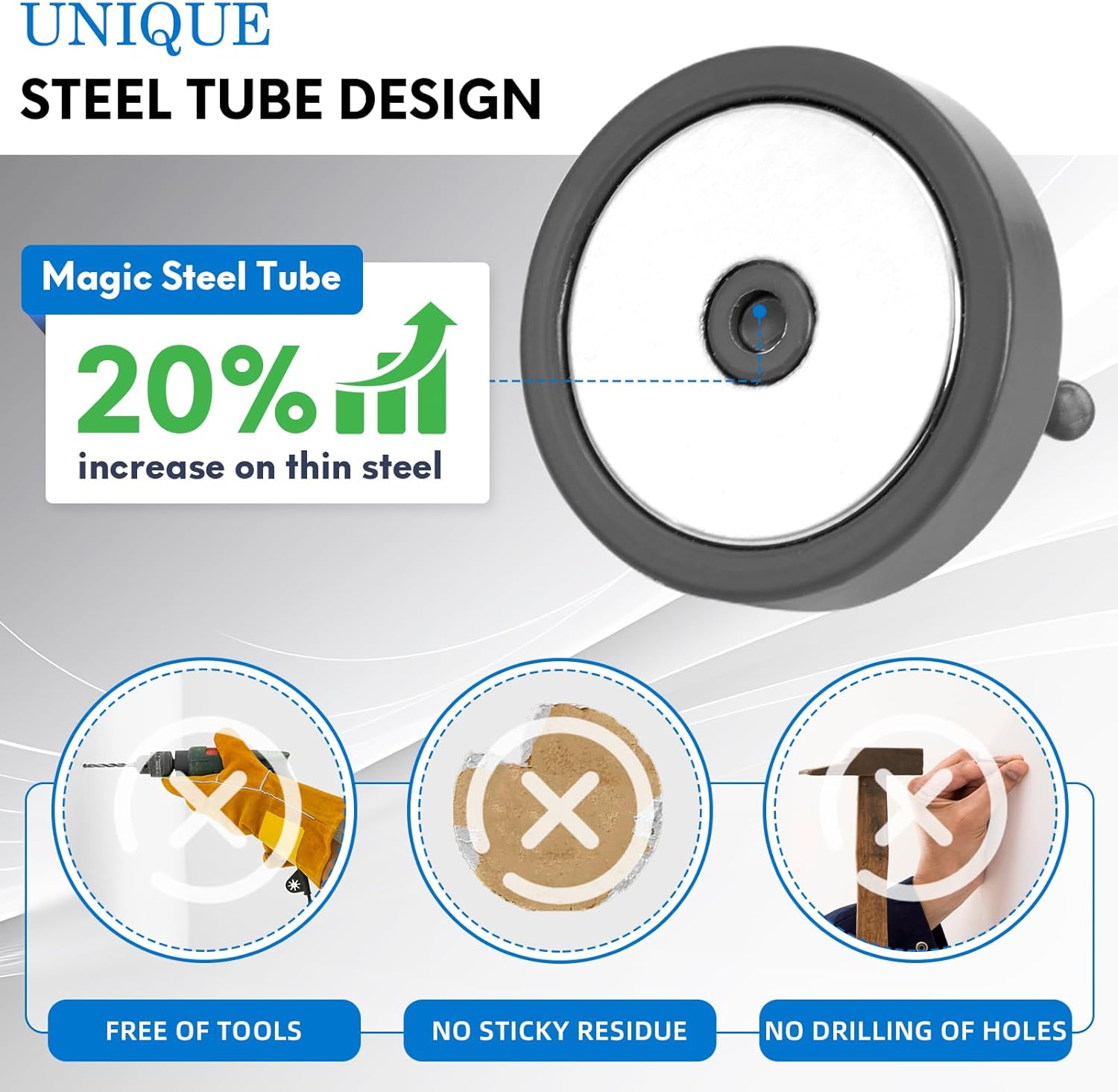 - ✔MAGIC STEEL TUBE DESIGN - Unique design of steel tube inside the base of magnetic hooks greatly increases the attractive force , especially on thin steel! It increase approximately 20% force comparing those none-tube magnets. it solves the problem of weak force on thin steel. Permanent magnetic hook with magic steel tube, strong magnetism lasts forever!