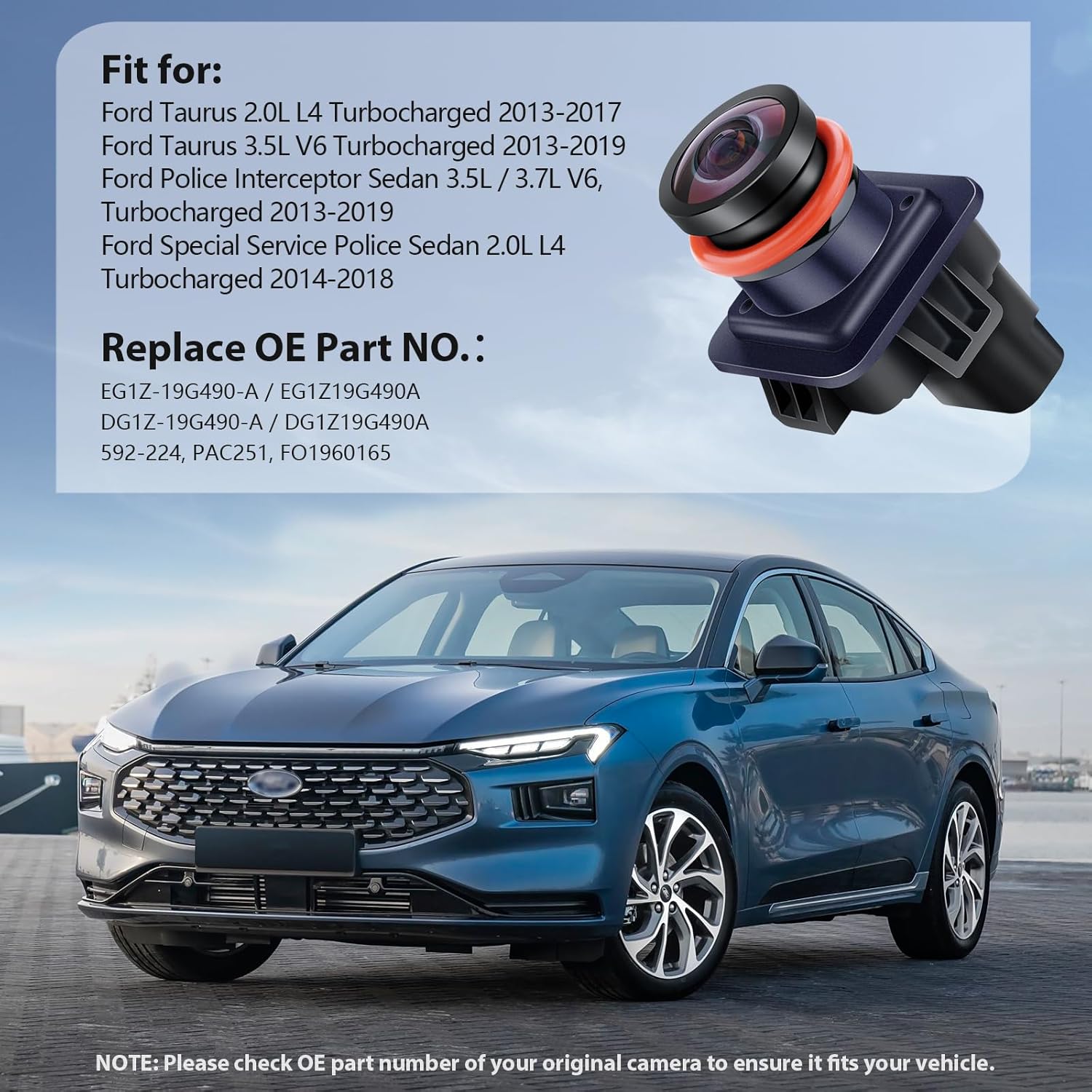 - Replaces OE Part Numbers: The Ford Taurus reversing camera is compatible with the following OE numbers: EG1Z-19G490-A, EG1Z19G490A, DG1Z-19G490-A, DG1Z19G490A, 592-224, PAC251 and FO1960165. Please verify that your original cameraโs OE number matches any of the above