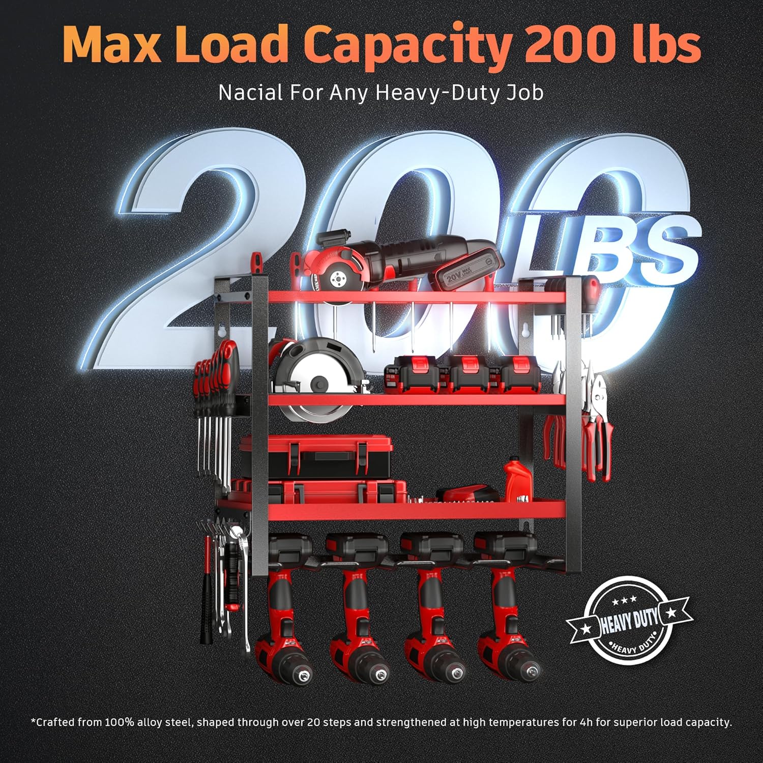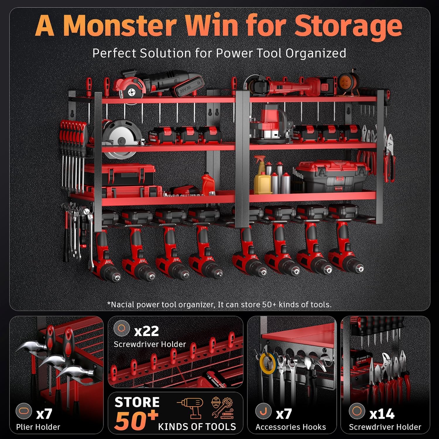 - A Monster Win for Storage: Nacial wall mount power tool organizer offers a larger, more optimized heavy-duty metal storage shelf for all your power tools and their compatible accessories. Crafted from premium cold-rolled steel (SPCC) and coated with carbon powder, it ensures unmatched stability and strength. Designed to hold up to 4 cordless drill, it features a versatile 4-layer storage rack. Say goodbye to endless searching and keep tools organized with our next-level storage solution
