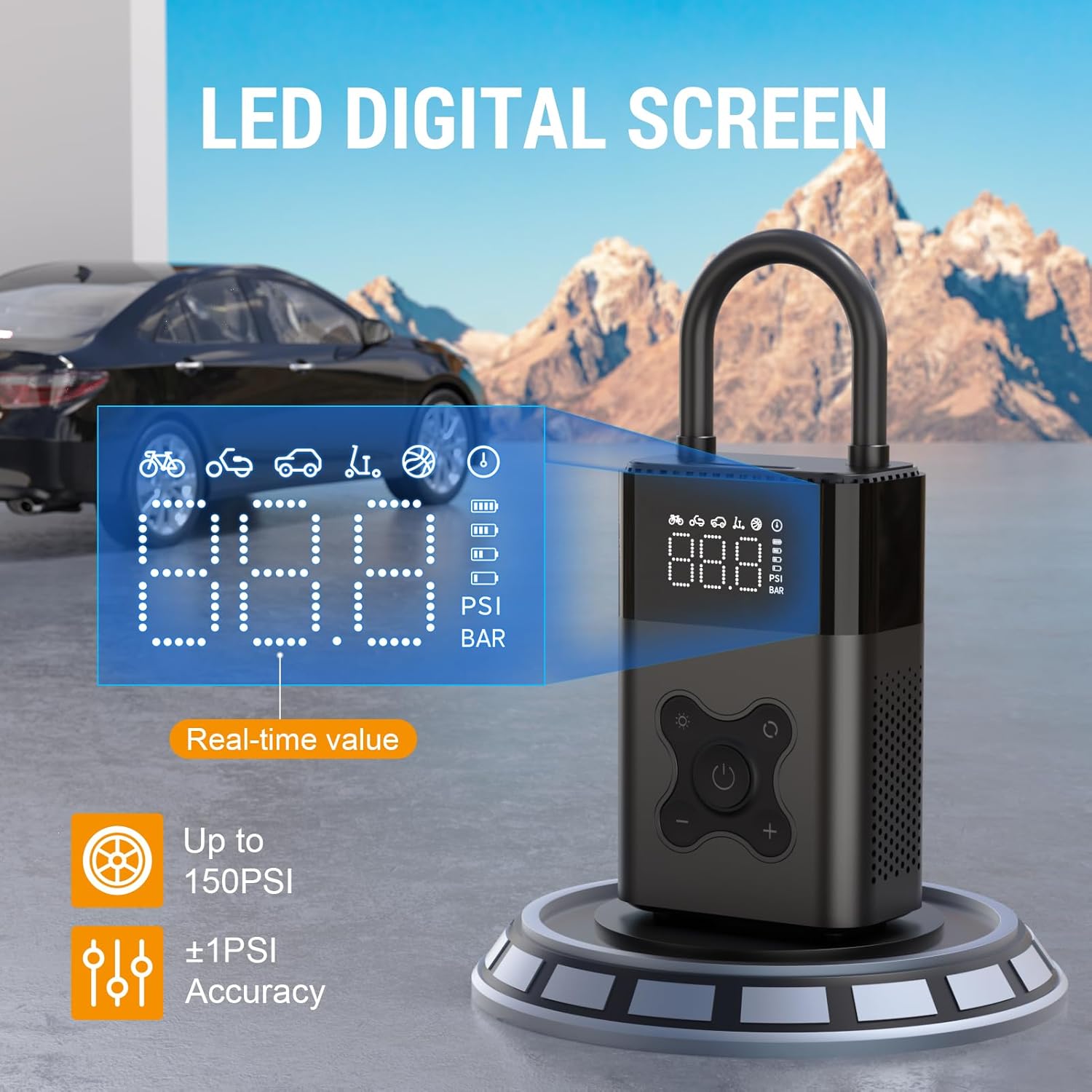 - Smart Tire Inflator:The inflator has 5 pre - set inflation modes for cars, motorcycles, bikes, electric bicycles, and balls. There's also a customizable 6th mode where you can set the pressure according to your specific requirements. It offers two pressure units, PSI and BAR, which you can switch between by pressing the changeover button for two seconds