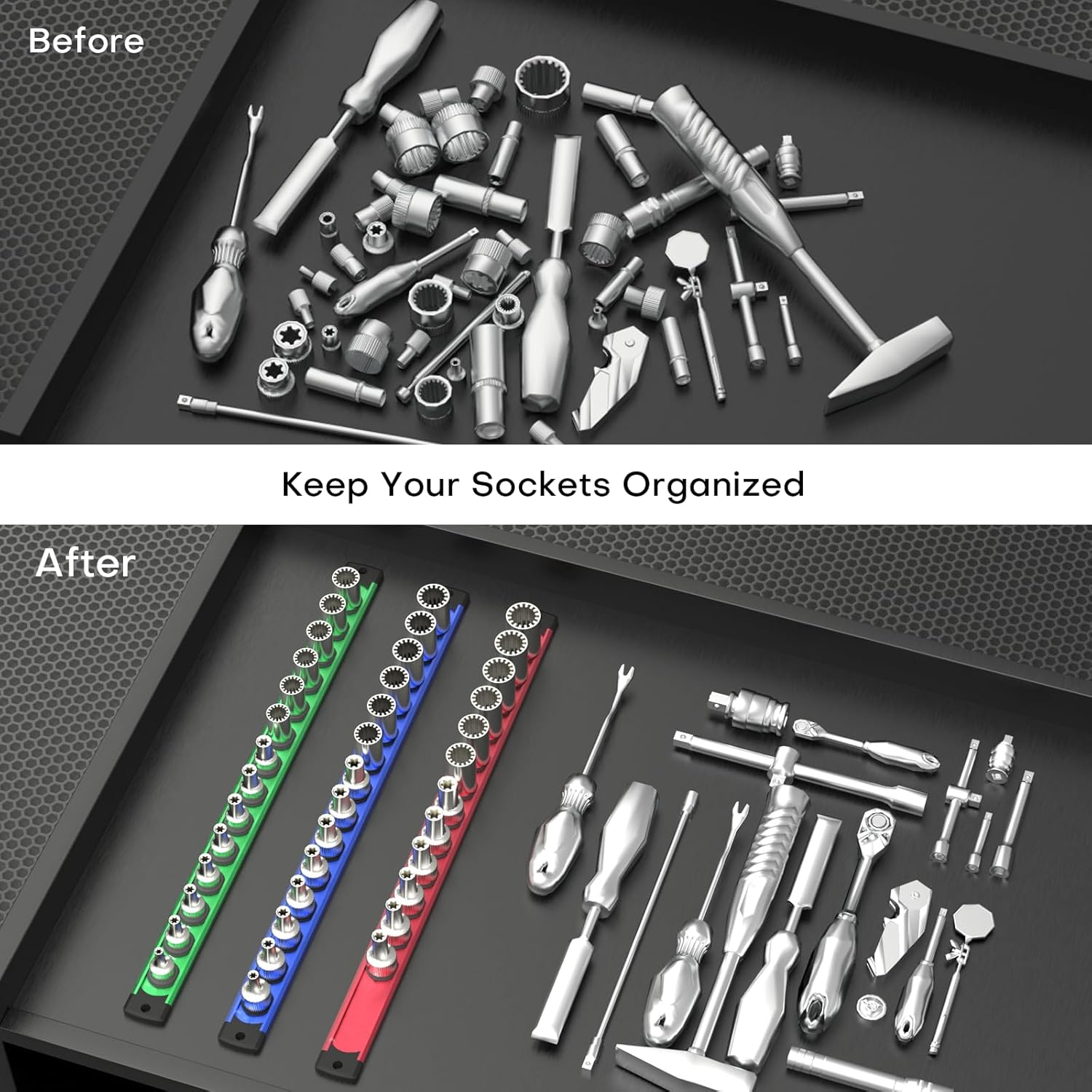 - 【Heavy Duty Materials】 Crafted from high quality durable aluminum alloy and ABS, our magnetic socket organizer is rust and corrosion-resistant, ensuring long-lasting performance in any workshop environment.