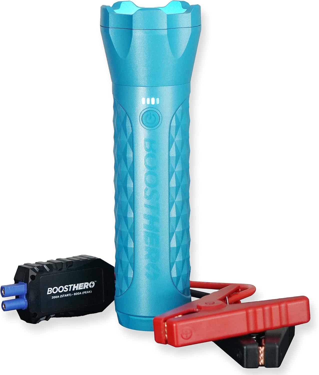 - Universal Jump Starter - The BoostHero is powerful enough to jump start most cars, trucks, SUVโs, boats, motorcycles, lawn mowers, ATVโs, and more! Instantly jump a drained vehicle battery by clamping the Smart Jumper Cables with the patent-pending mini flashlight directly onto the vehicle battery terminals. Powerful 800A peak current to jump-start vehicles with up to 6.0L gas or 4.0L diesel engines.