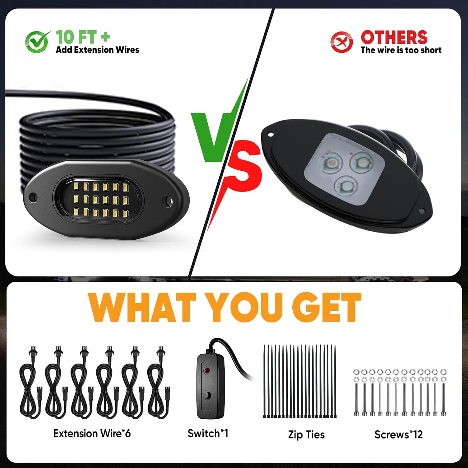 - ăWhite Rock Lights with SwitchăEquipped with an easy-to-use switch, you can effortlessly control the pure white rock lights kits, allowing you to turn them on or off as needed, helping to conserve battery power