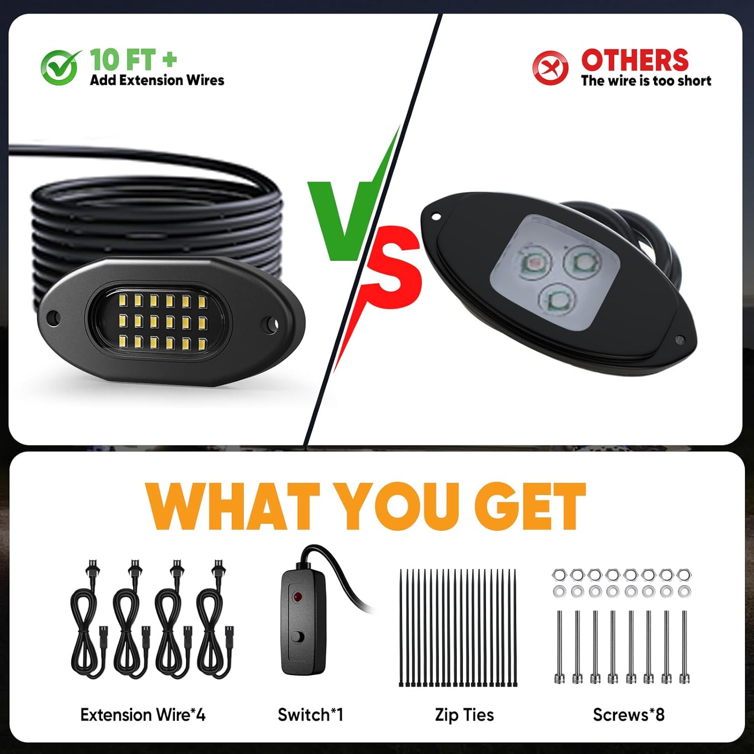 - ăBrilliant Pure White LightăPure White led rock lights kits have a 6000K color temperature provides bright, clean illumination, each light is equipped with 18 high-brightness LED beads, providing excellent visibility under your vehicle without the need for complicated color adjustments