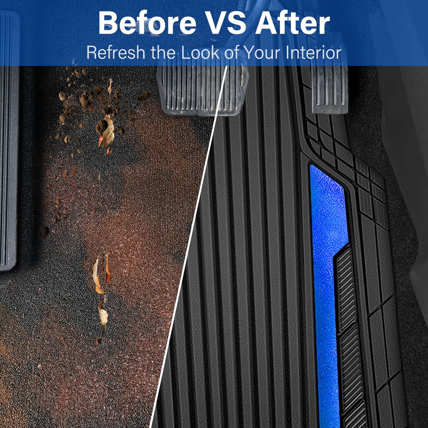 - 【All Weather All Season Protection】Chrome metallic aluminum Film heavy duty rubber car mats use for all season.Ridge channels specifically design to prevent fluids from leaking onto carpets,the deep channels also trap any mud, dirt, water or snow that gets in your car.