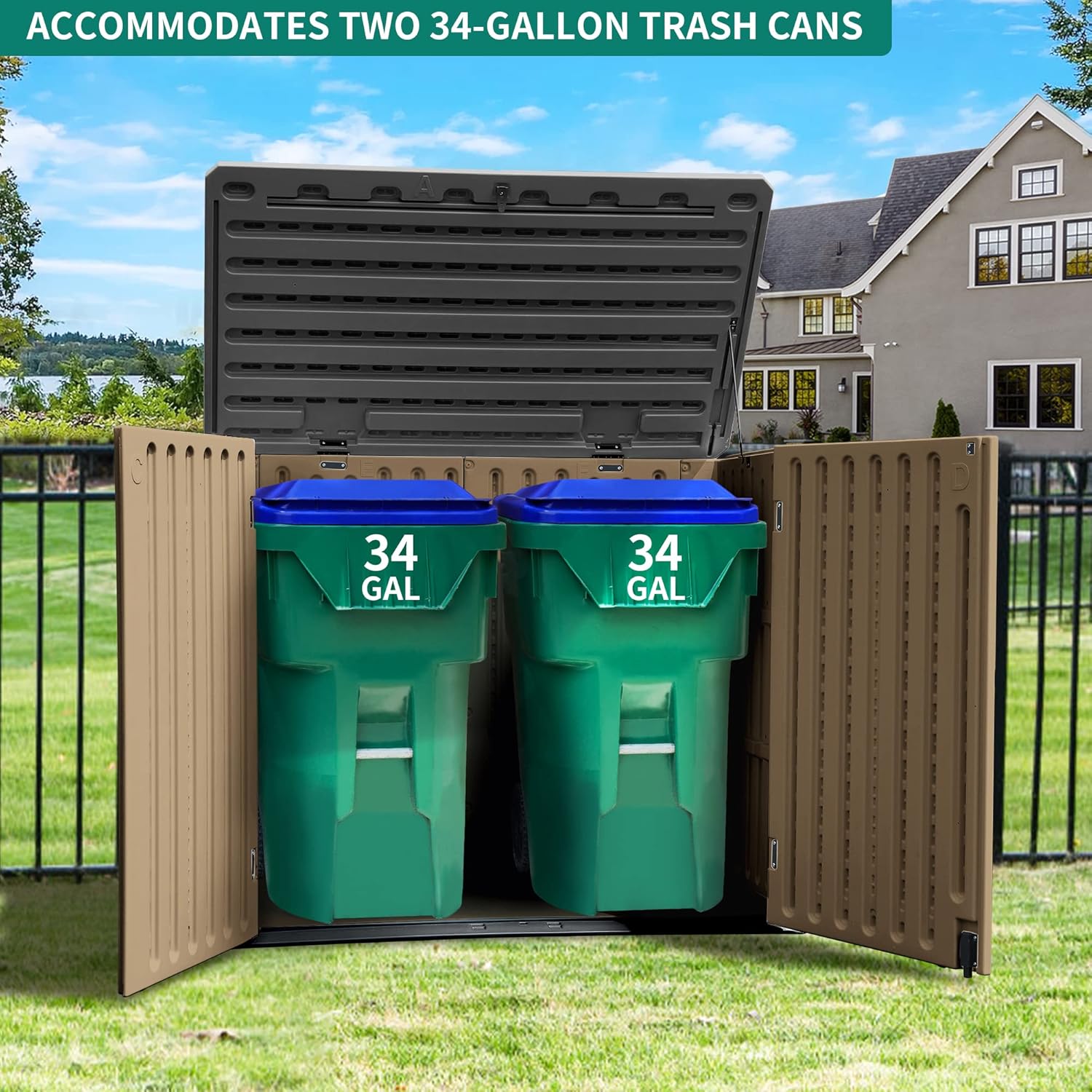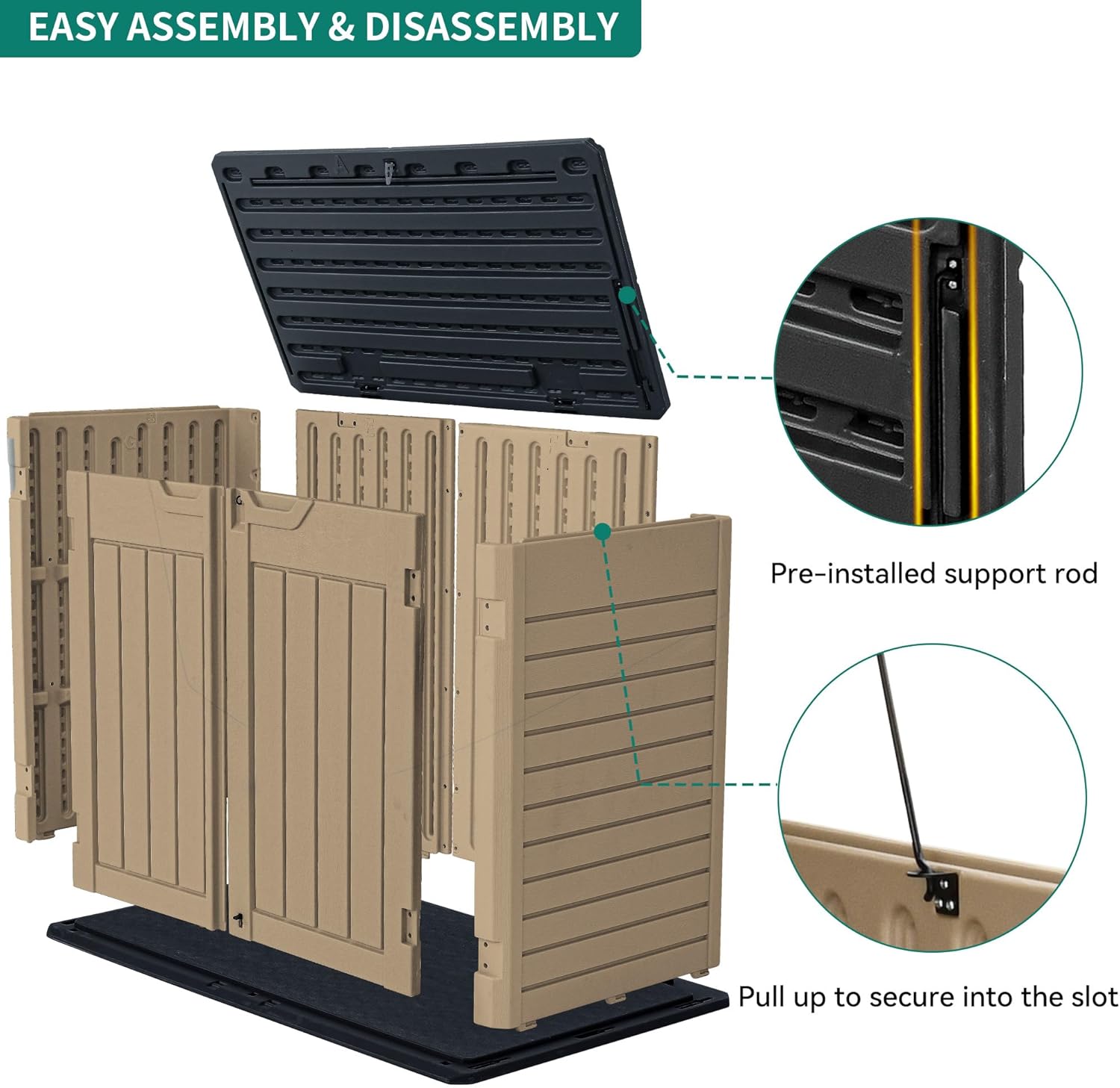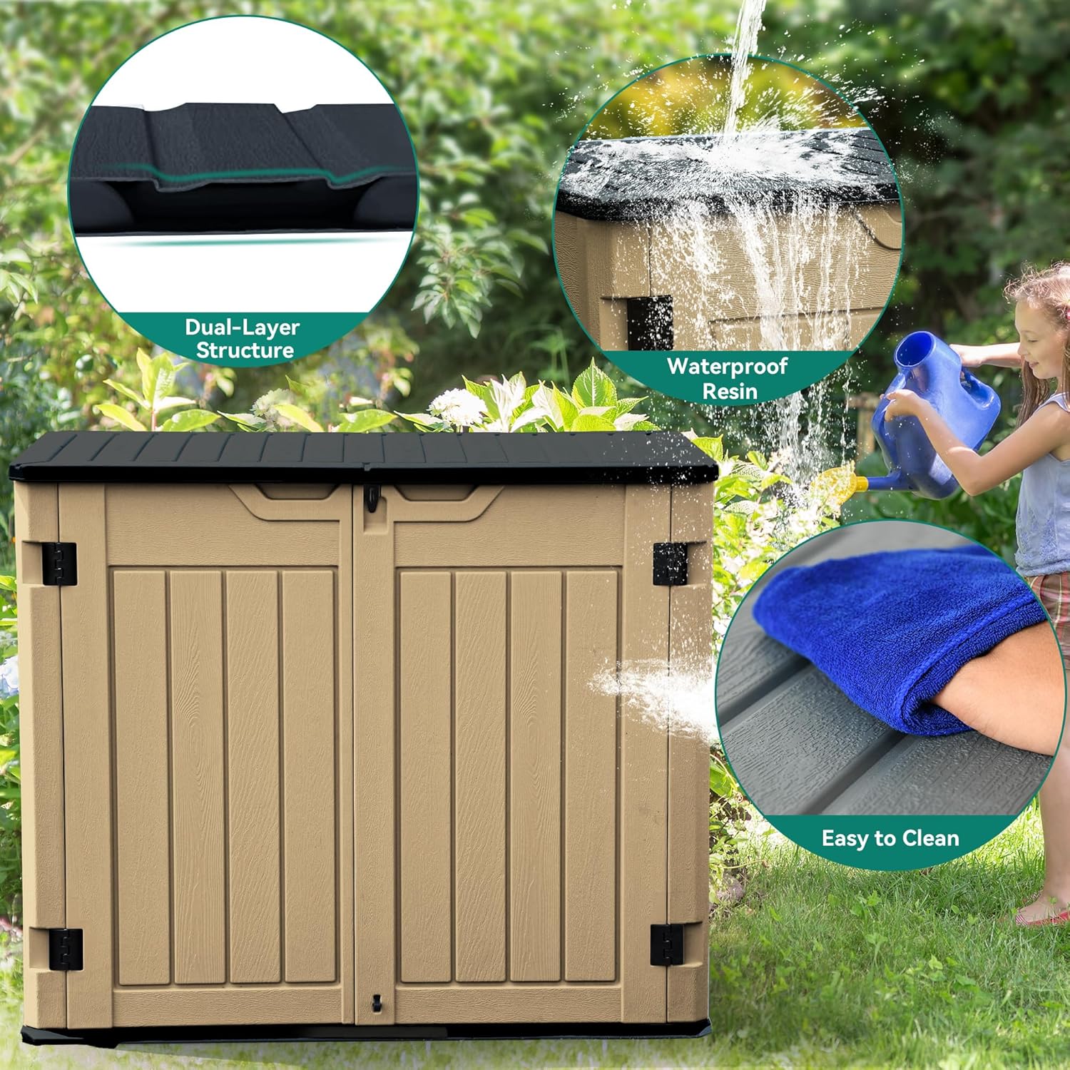 - ALL-WEATHER RESISTANT- This storage shed is made from weatherproof resin for UV protection, all-weather use, easy cleaning and maintenance; Alluring wooden texture will not fade and the innovative lid design keeps water out