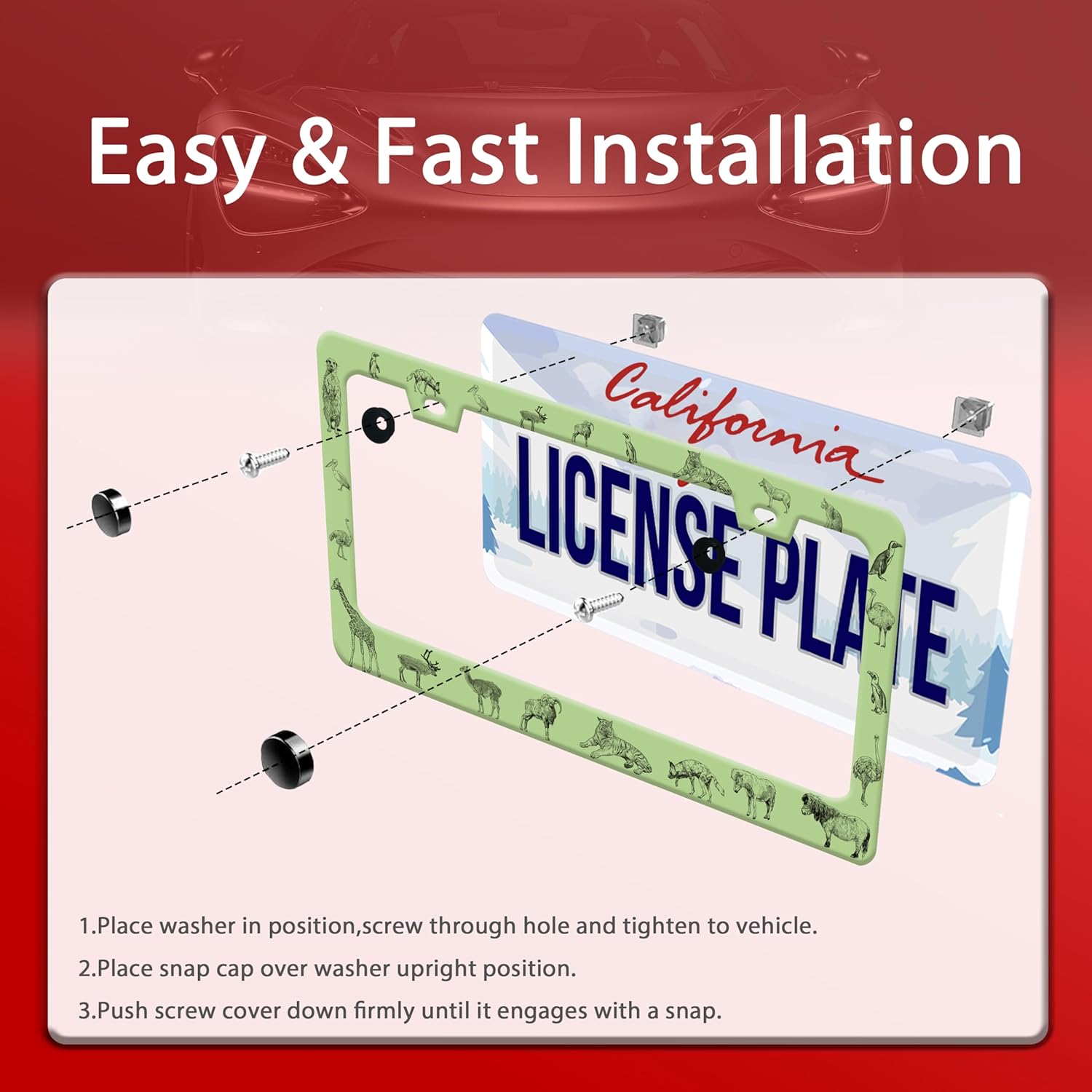 - 【Products And Accessories】:license plate holder, including (screws, screw covers, washers) above the slot, use the included accessories to install the license plate holder, easy to operate, quick installation, no special tools required.