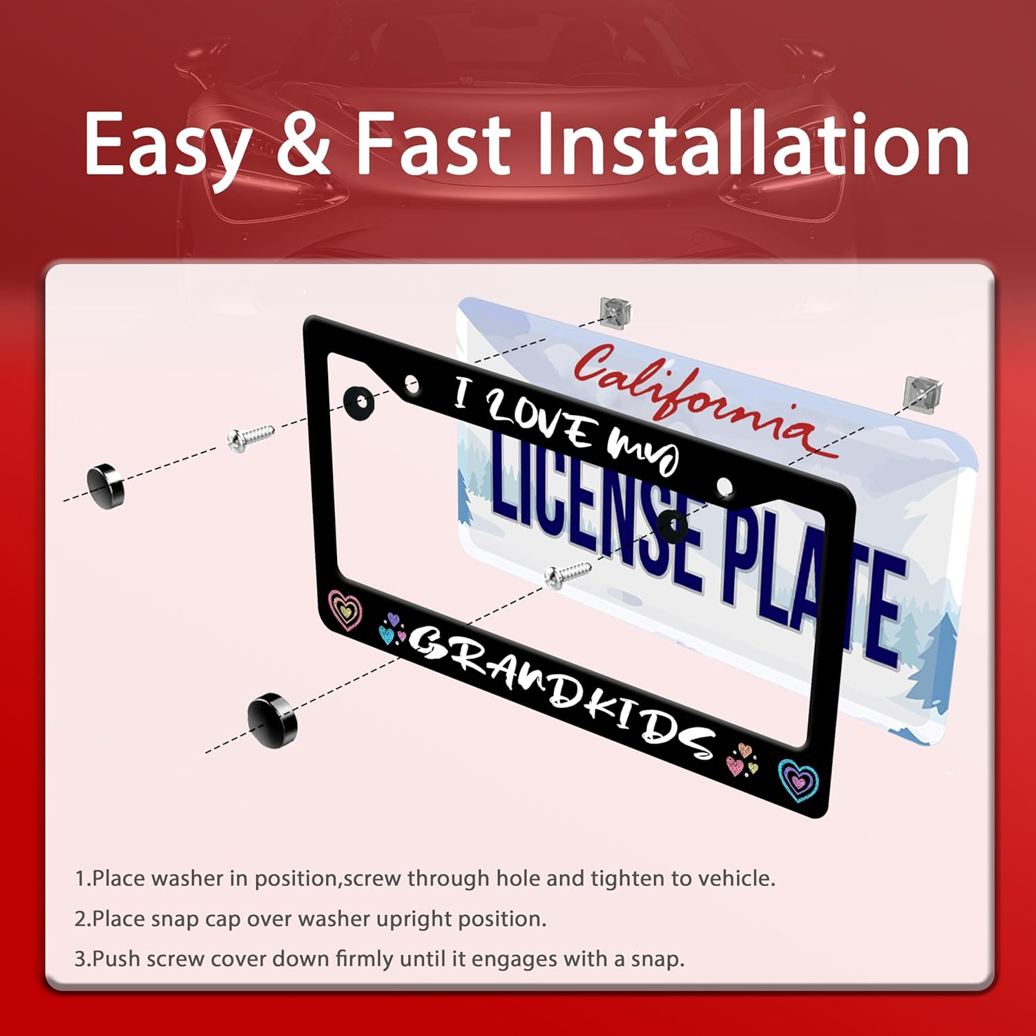 - 【Products And Accessories】:license plate holder, including (screws, screw covers, washers) above the slot, use the included accessories to install the license plate holder, easy to operate, quick installation, no special tools required.