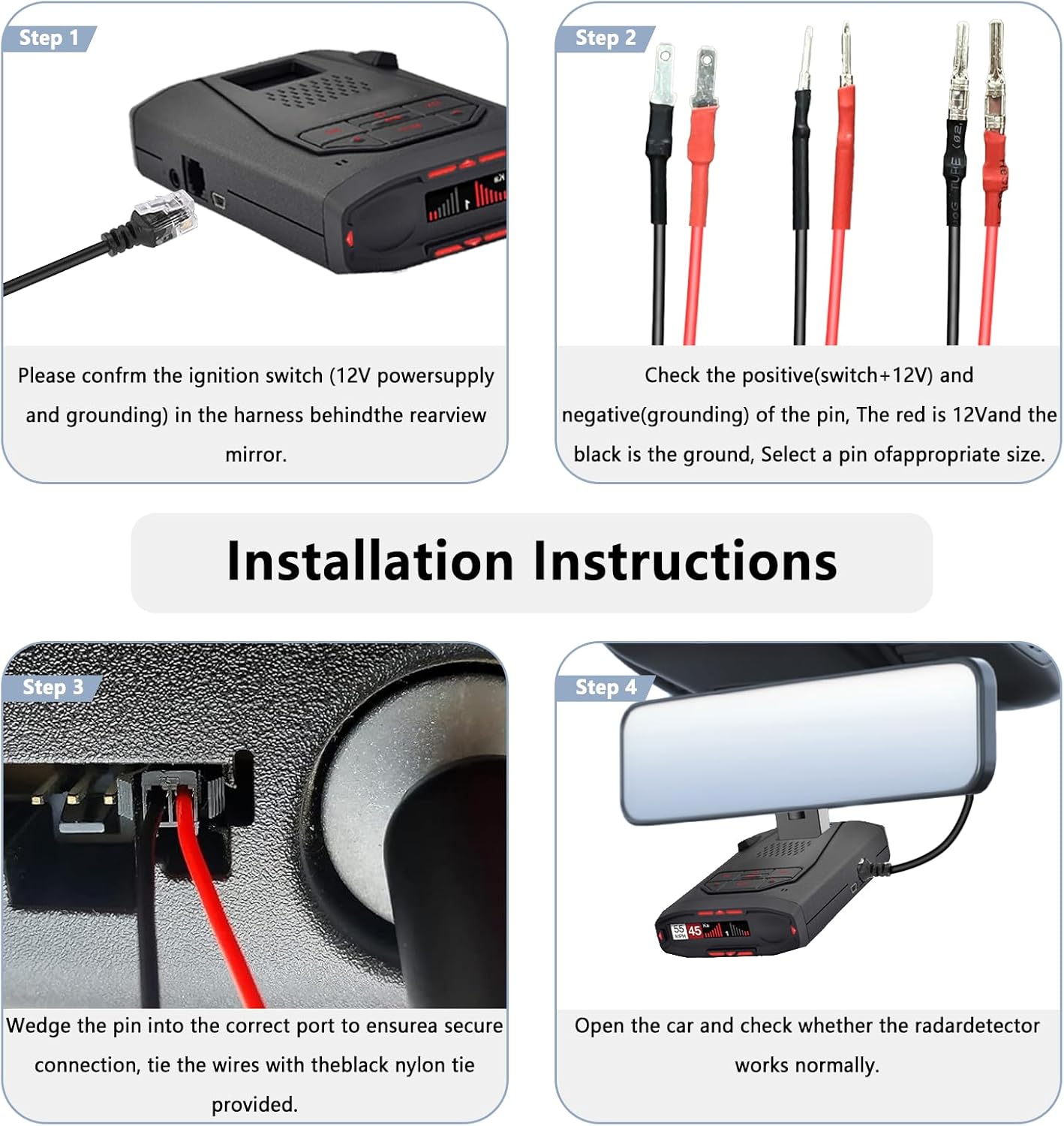 - radar detector hardwire power cord is 13.8 inches, and it is equipped with an upgraded magnetic ring that has a good suppression effect on high-frequency noise, allowing normal and useful signals to pass through well, The attached zip ties can keep the cable clean.