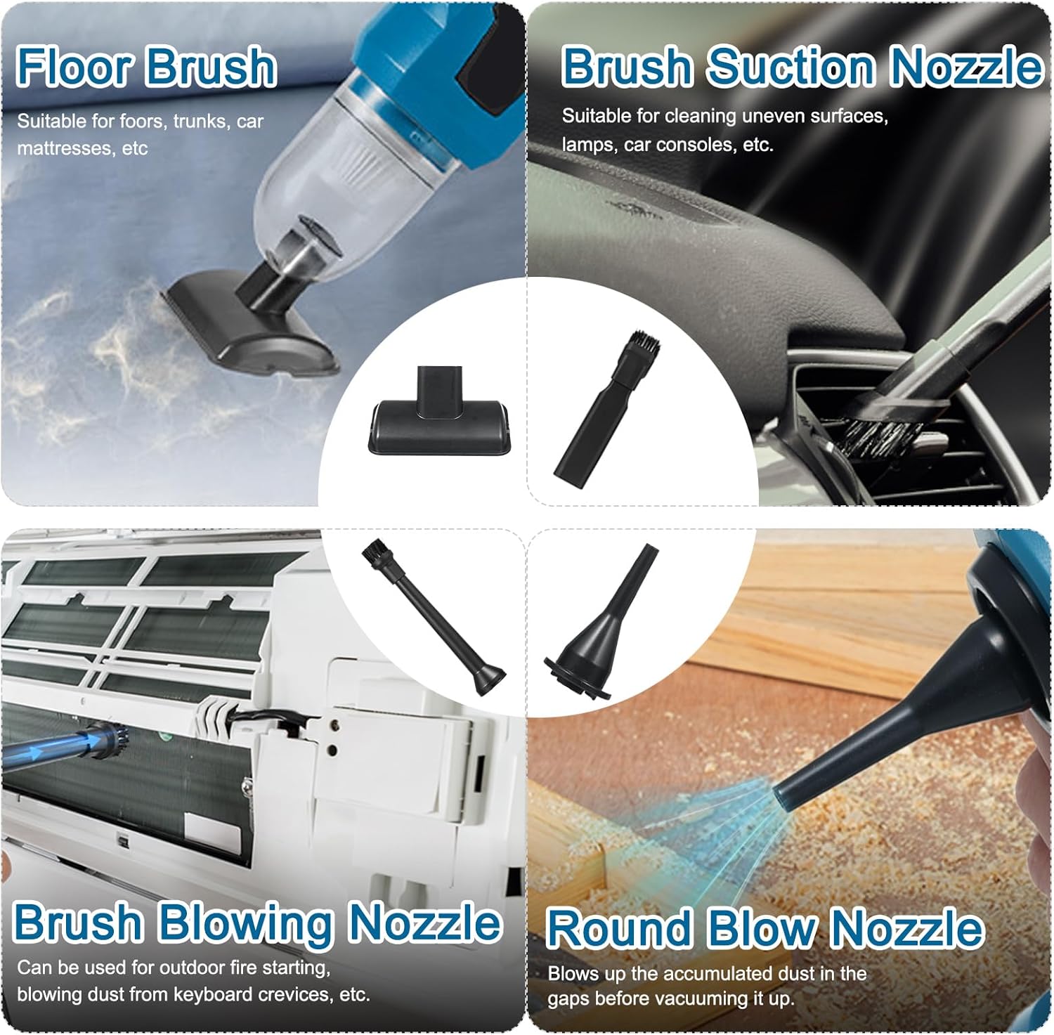 - ăVersatile UseăMulcort small vacuum cleaner cordless excels in suction, blowing, and inflating functions. It provides powerful suction for thorough cleaning of car interiors, office spaces, and more. Cordless Car Vacuum Cleaner included blowing, with a maximum airflow of 700L/min, efficiently removes dust and debris from delicate surfaces, such as keyboard keys and office equipment. The inflating function is perfect for inflating swim rings, inflatable boats, and balloons. With accessories including an inflating nozzle, floor brush, cleaning brush, and blowing nozzle, this vacuum meets various cleaning needs and offers comprehensive versatility.