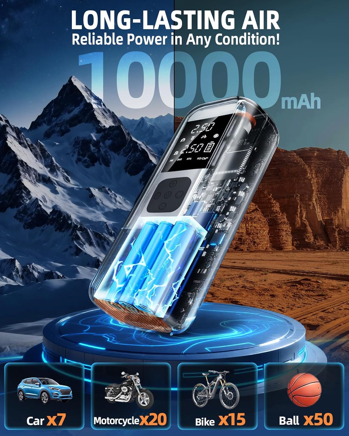 - 【Accurate Measurement & Auto Shut-off】Our patented sensor monitors tire pressure in real-time with ±1 PSI accuracy, and display real-time pressure values on the digital display. The portable air compressor automatically shuts off when reaching your target pressure, eliminating over-inflation risks. Set it and forget it, perfect for beginners and pros alike.