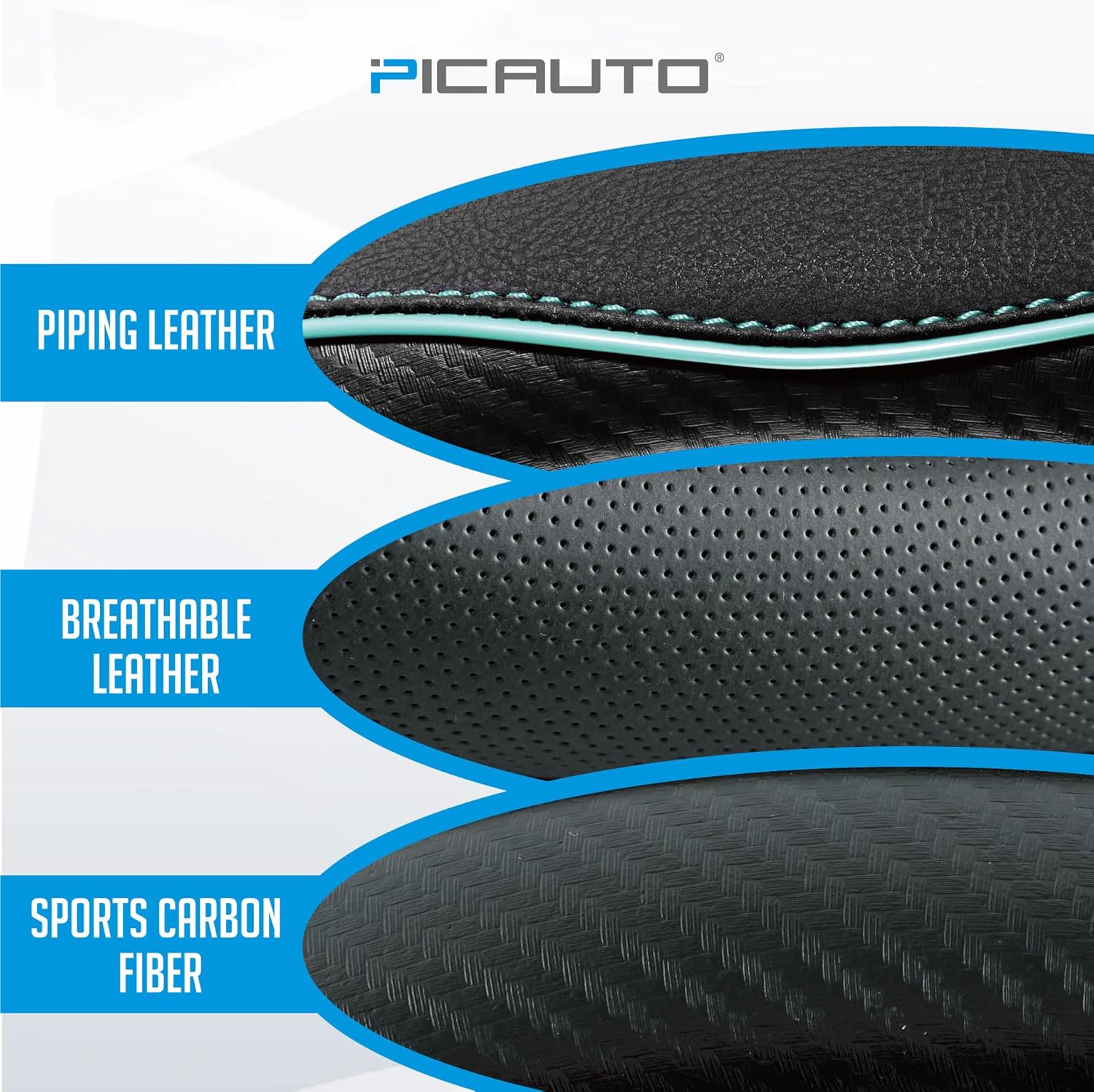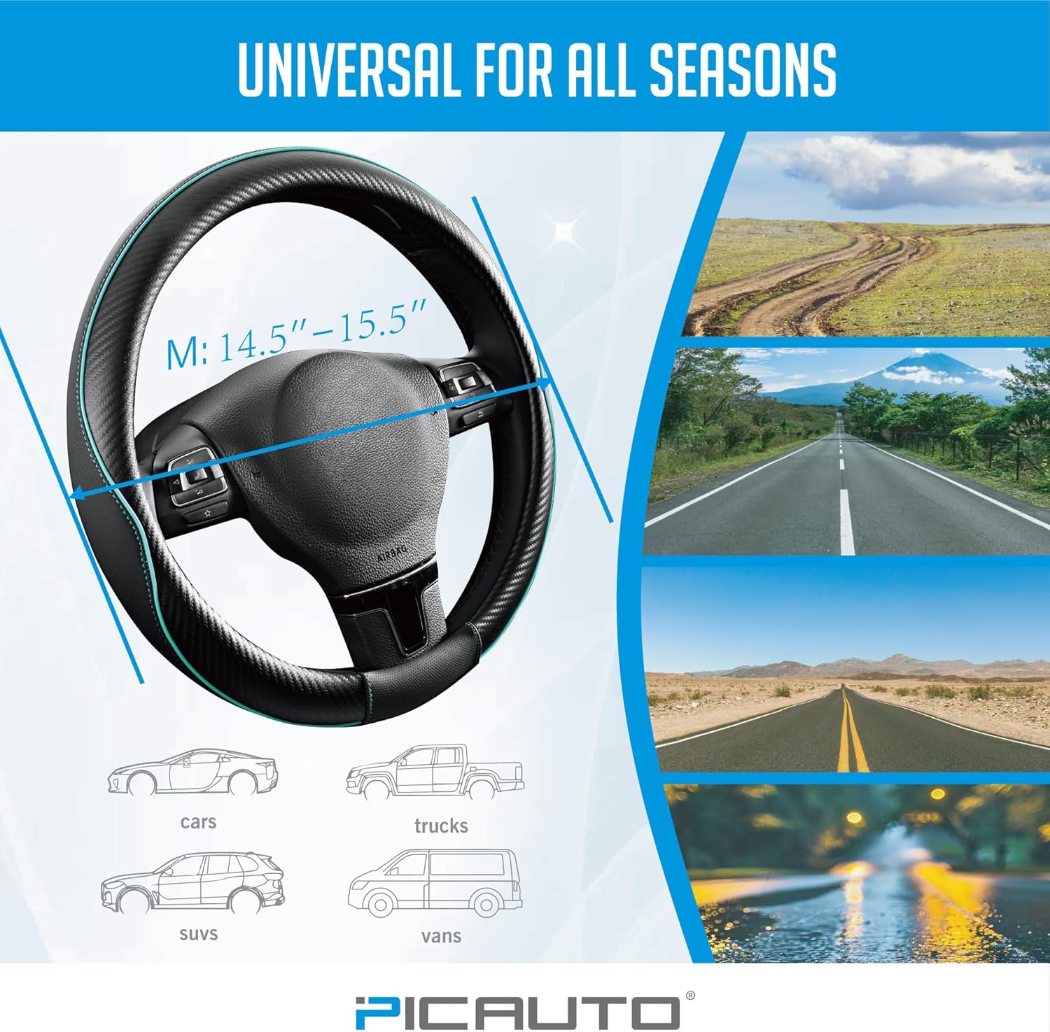 PIC AUTO Steering Wheel Cover, Mint Piping Leather, Sports Carbon Fiber and Super Breathable Leather, Universal 14.5-15.5 Inch Anti-Slip Steering Wheels Accessories for Men & Women
