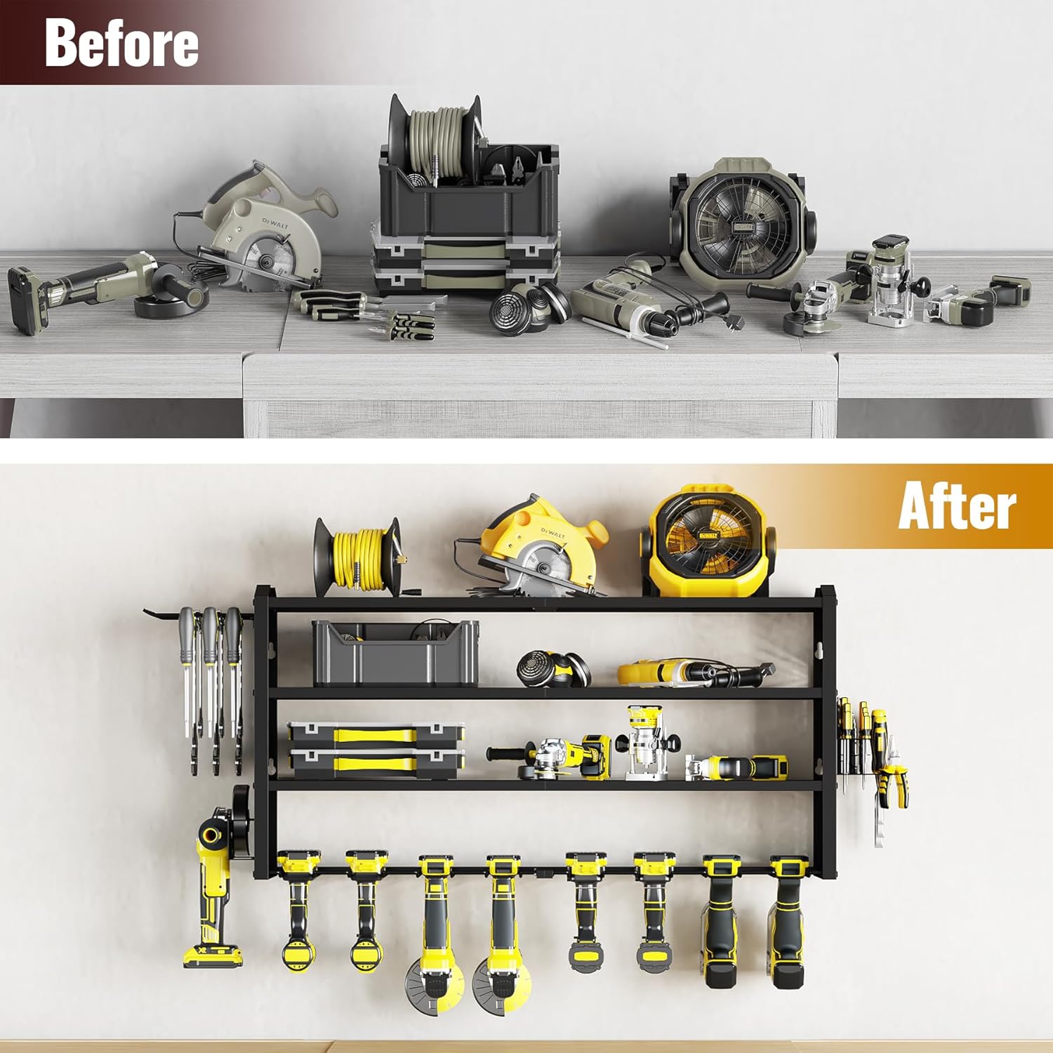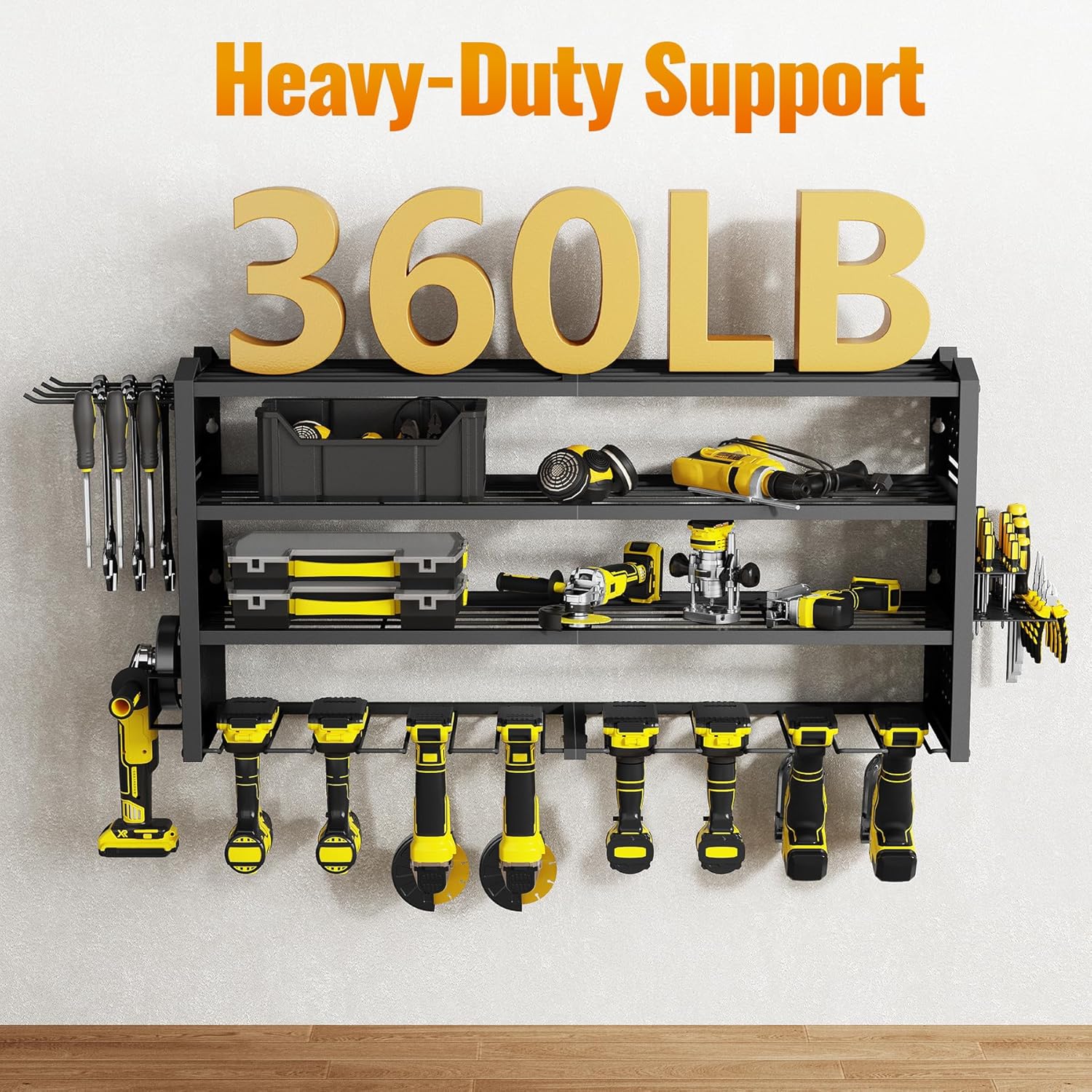 Tomorotec Wall-Mounted Power Tool Storage Rack for Drill, Toolbox & Accessories, Heavy-Duty Steel Organizer with Side Hooks and Adjustable Shelves, Easy Installation Garage & Workshop Storage (Black)