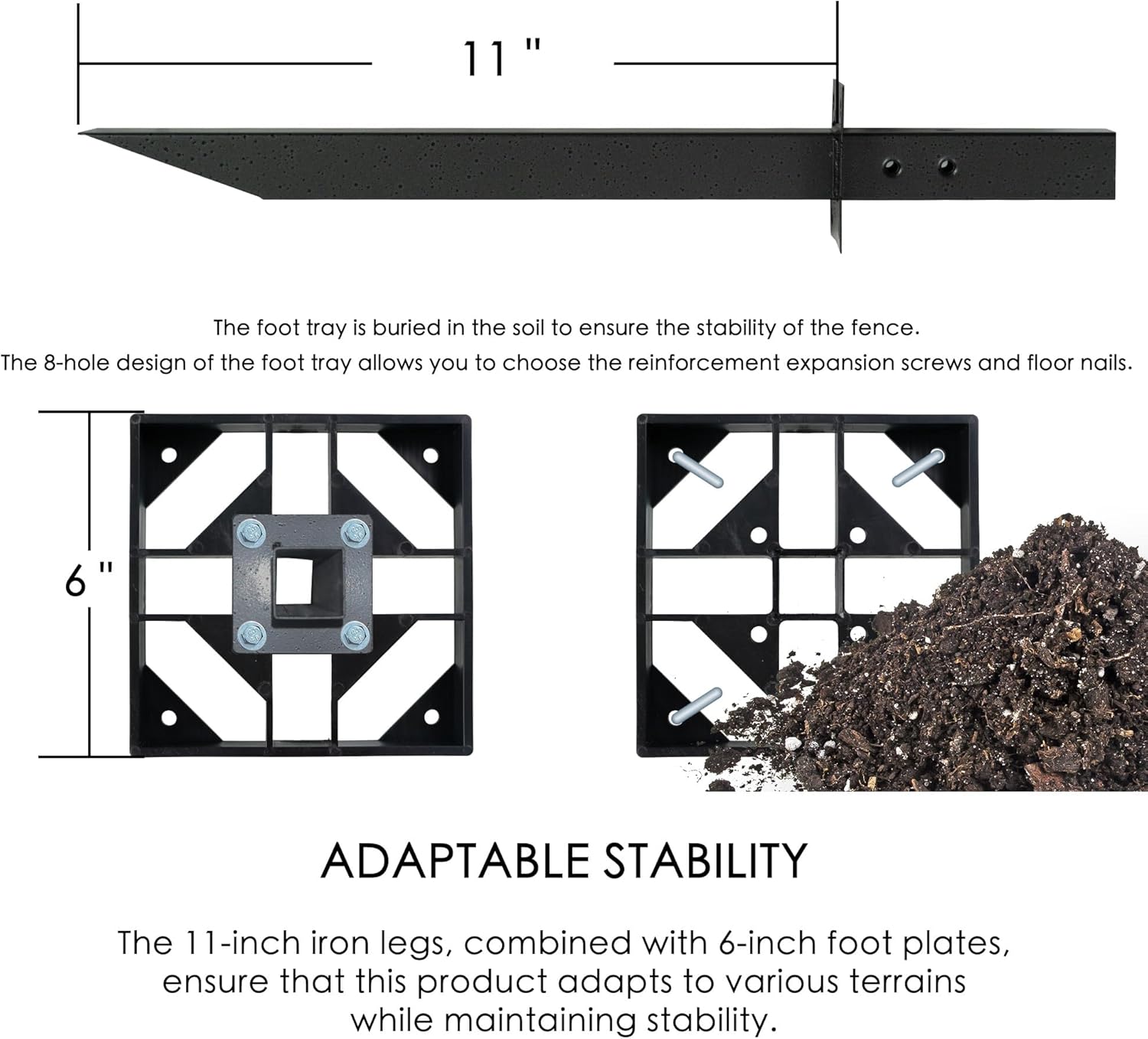 - π‘ Adaptable Stability: The 11-inch iron legs, combined with 6-inch foot plates, ensure that this product adapts to various terrains while maintaining stability. The foot tray can be buried in the soil for added stability.