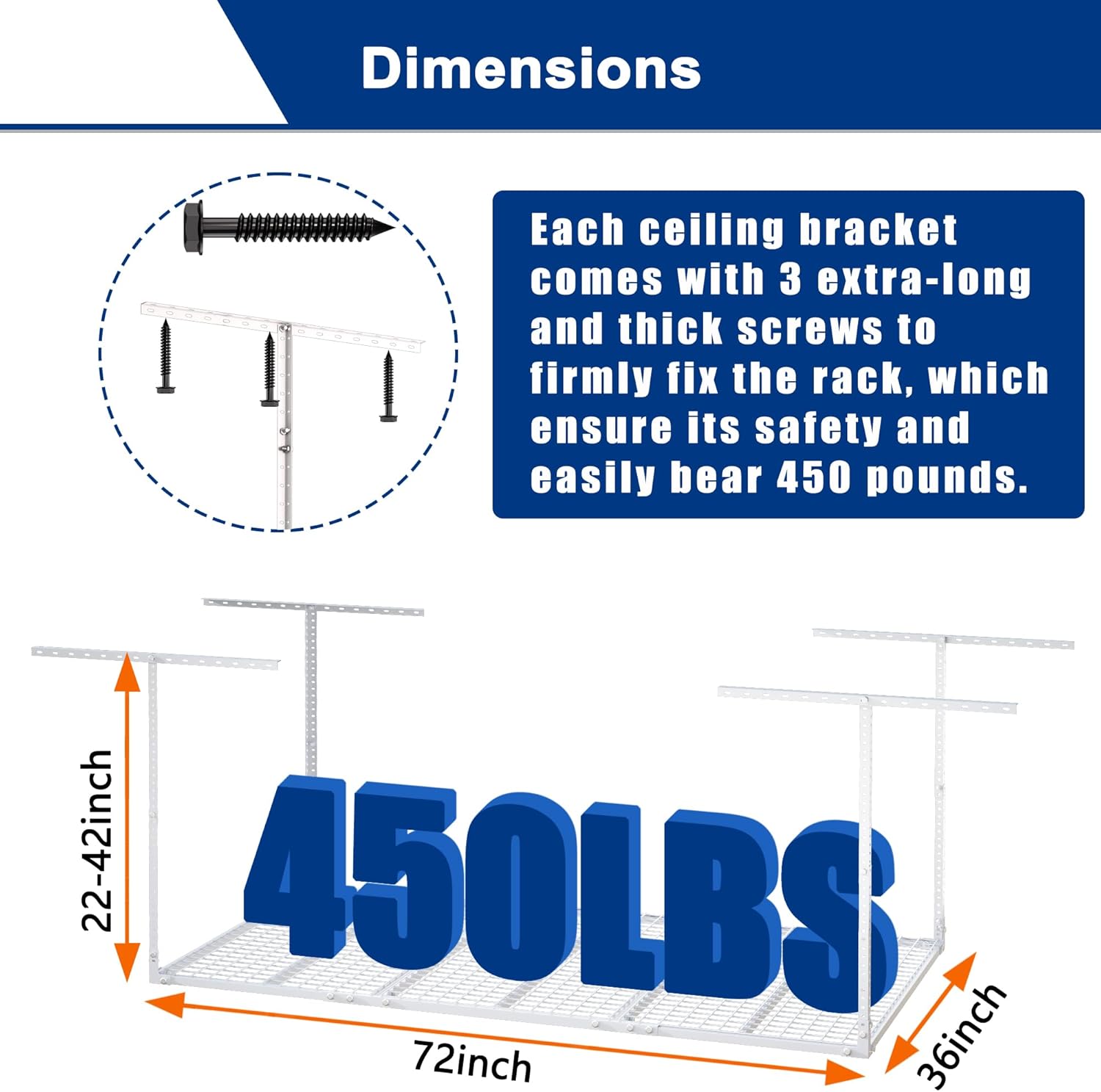 - MORE SPACE: The garage classic ceiling storage rack features a sturdy and reliable pull-down structure design. The height adjustment range is from 22 inches to 42 inches, providing up to 42 cubic feet of storage space. It is suitable for storing idle large items, making your garage neat and bringing you a pleasant mood.