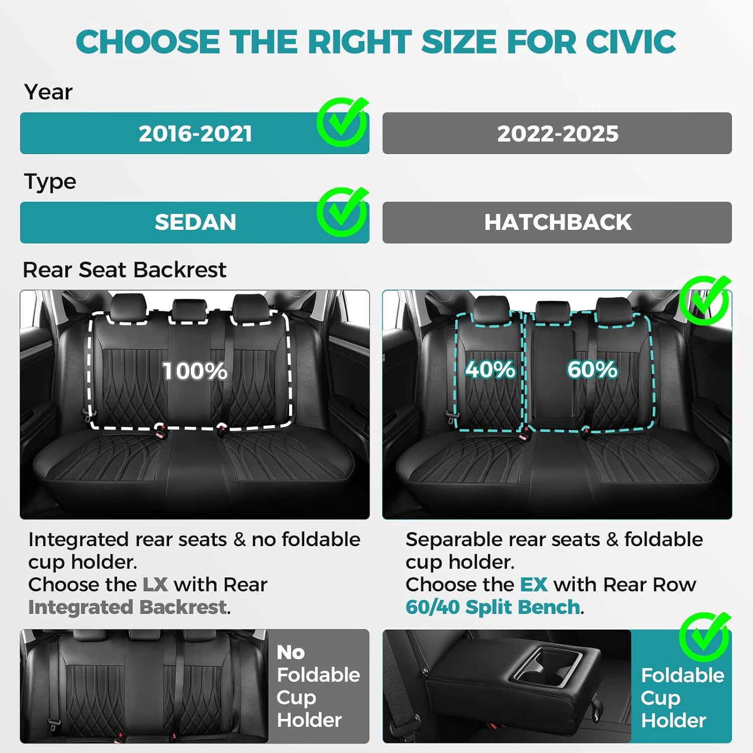 - Tailored for Civic - Designed exclusively for civic, ensuring a perfect fit like a glove.Say goodbye to ill-fitting, sliding universal covers with limited coverage.Please note that these size only fit for the 2016-2021 Civic Sedan EX-L, EX-T, EX, Touring, LX-P, Sport.Ensure that your back row has three seats that are split 40/60 and equipped with foldable cup holder armrests, and that your Civic is a sedan model.