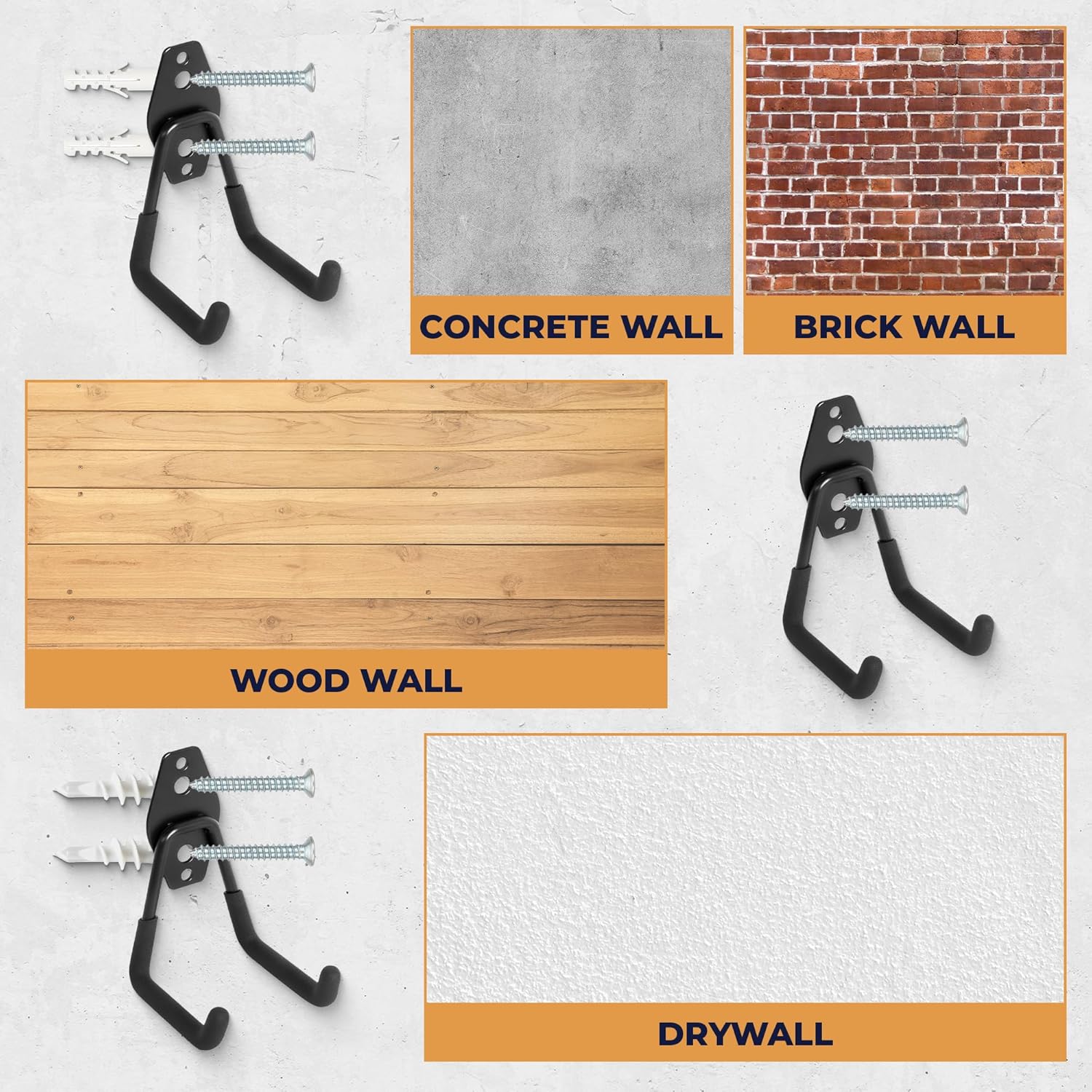 - Easy to Install - Comes with a total of 56 sets of screws and anchors for drywall, wood, or concrete. With only a screwdriver, the garage heavy-duty storage hooks can be easily installed on plaster walls and drywall, or with a small drill for wooden, concrete, and brick walls.