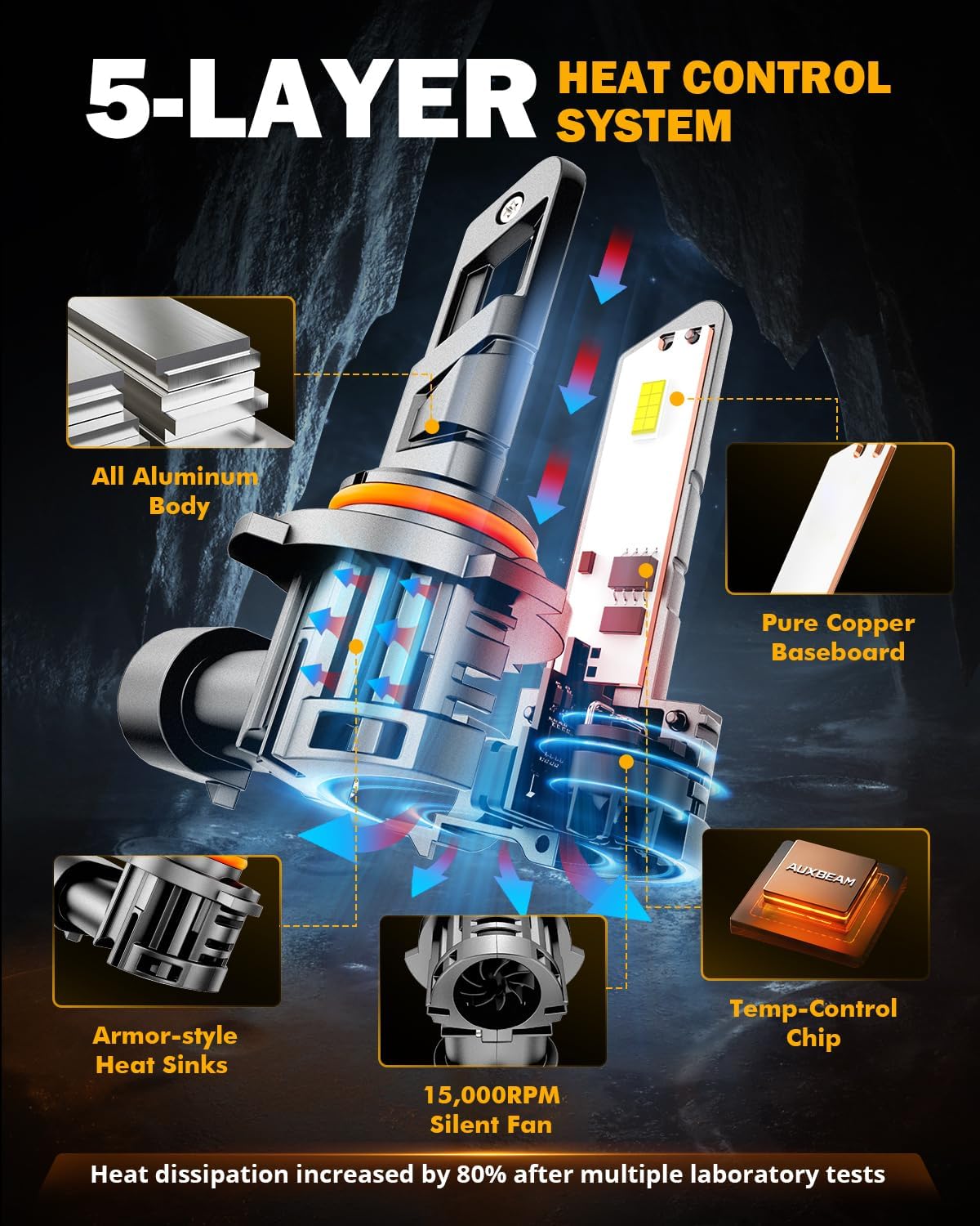 - Temp Control System: Designed with built-in latest temp control chips, 15,000RPM 9-blade silent fan, pure copper baseboard, all 6063 aviation aluminum lamp body, armor-style heat sinks. Directly improves 80% heat dissipation and gain an extend service life over 50,000 hours.